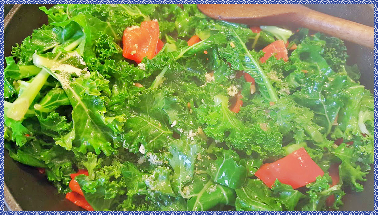케일은 숨이 죽고 열로인해서 먹기좋은 식감으로 변했어요. 완성입니다. 접시에 담아주세요.