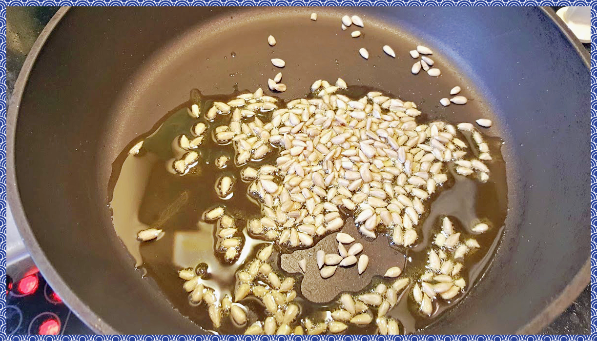 팬에 오일을 두르고 해바라기씨를 넣어 볶아 줍니다. 저는 구운 해바라기씨의 바삭한 식감이 좋아 볶음요리에 자주 사용해요.