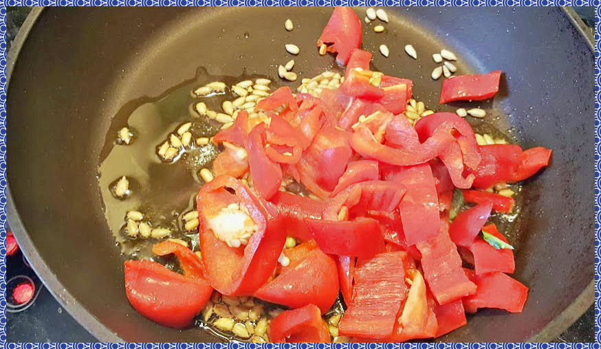 해바라기씨가 노릇하게 구워지면 작게 썰은 파프리카를 넣어주고 같이 볶아 줍니다.