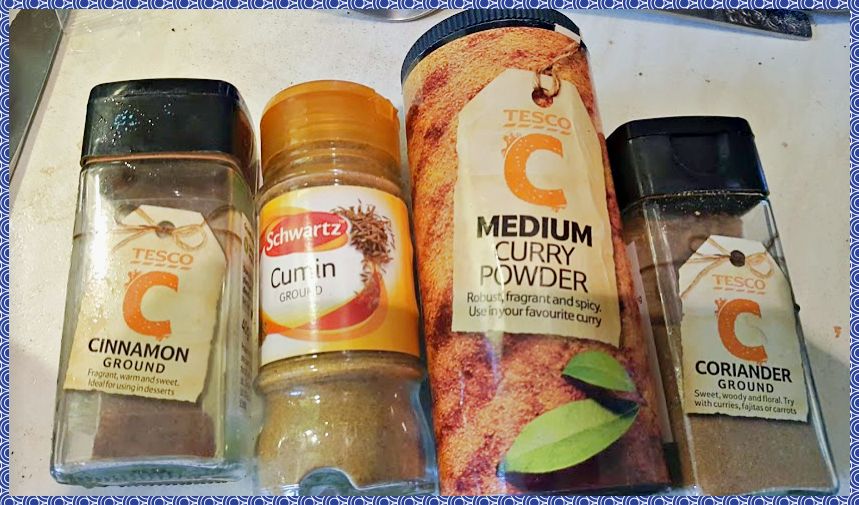 오늘 제가 콩에 넣은 향신료는 계피가루, 쿠민가루, 코리엔더 가루, 커리가루입니다.