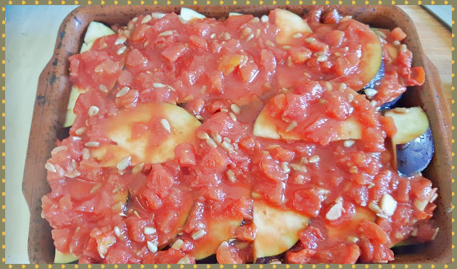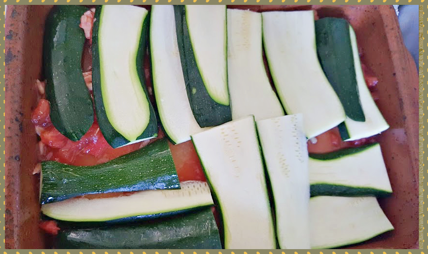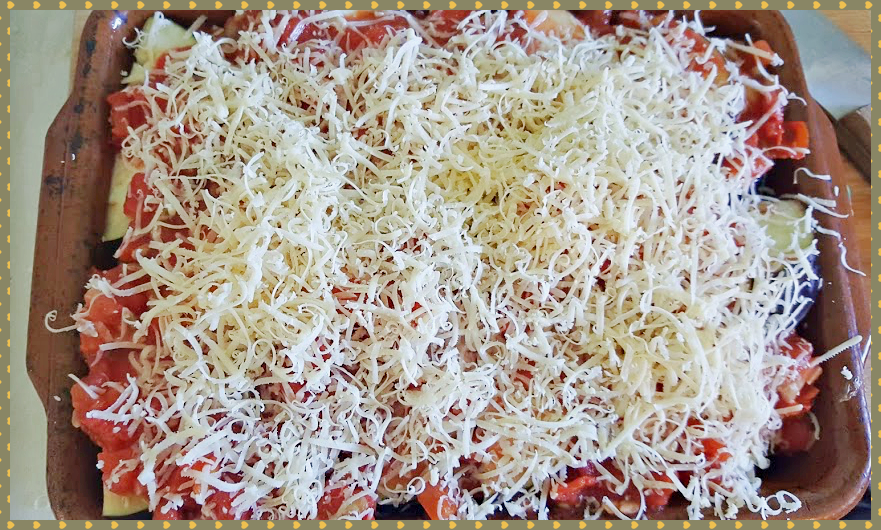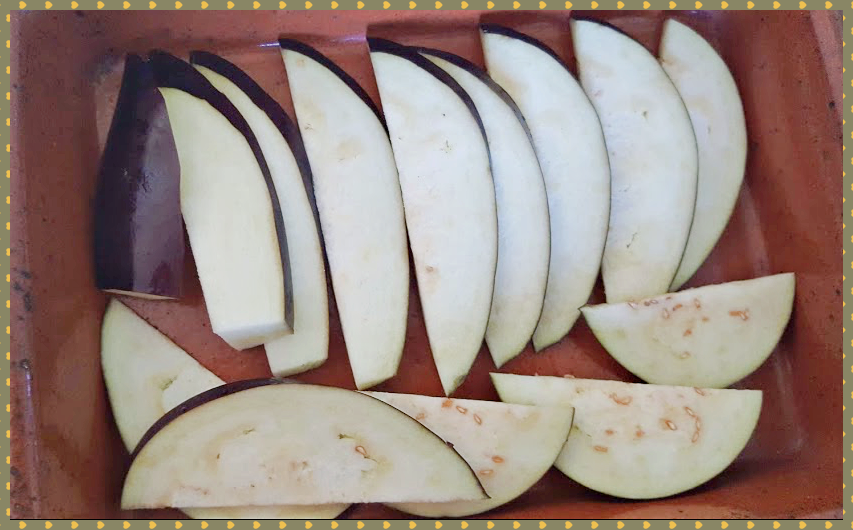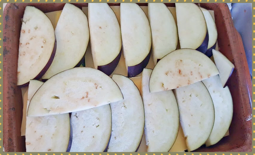 오븐디쉬에 얇게 썰은 가지를 나열해 주세요. 실제로 이태리에선 라쟈냐 시트 대신 기름에 한번 튀긴 가지를 토마토 양념한 고기 사이에 껴 라쟈나처럼 구워낸 음식이 있어요. 정말 맛있거든요.
