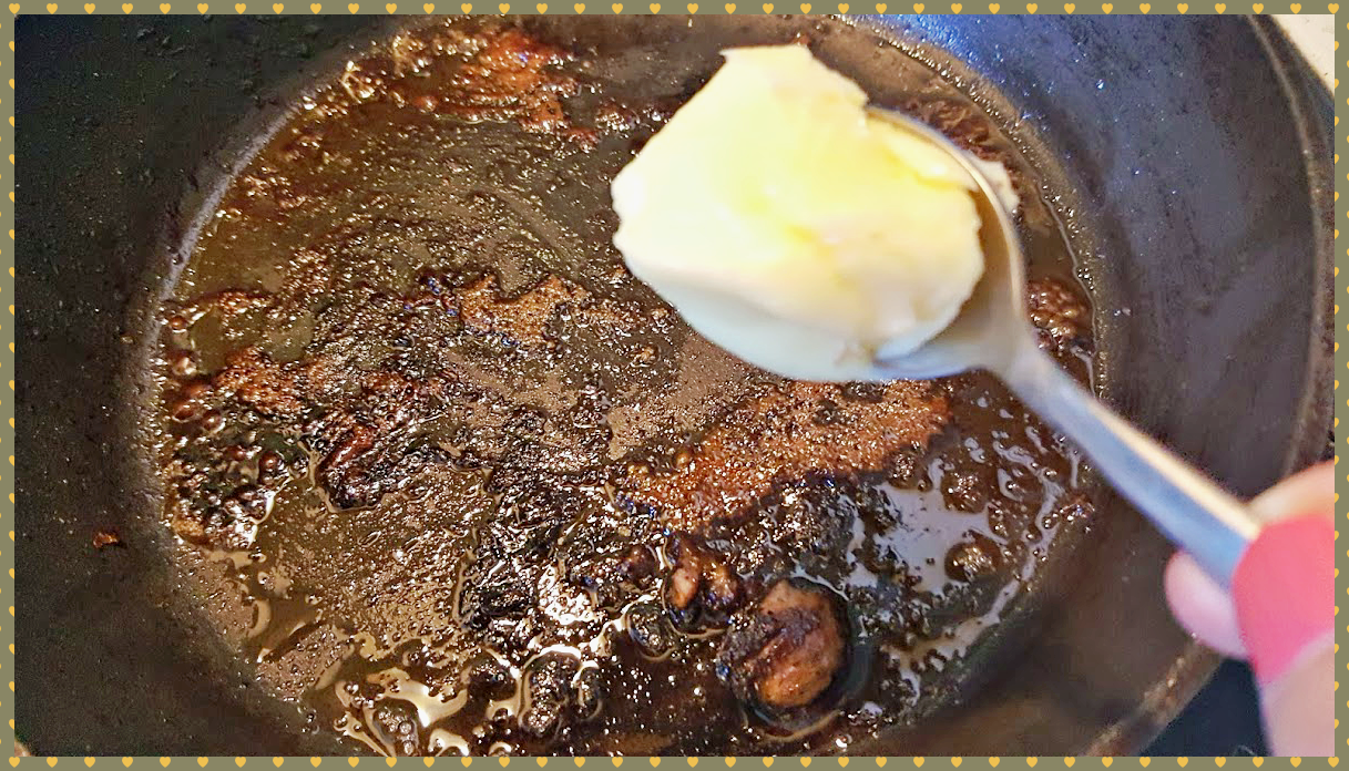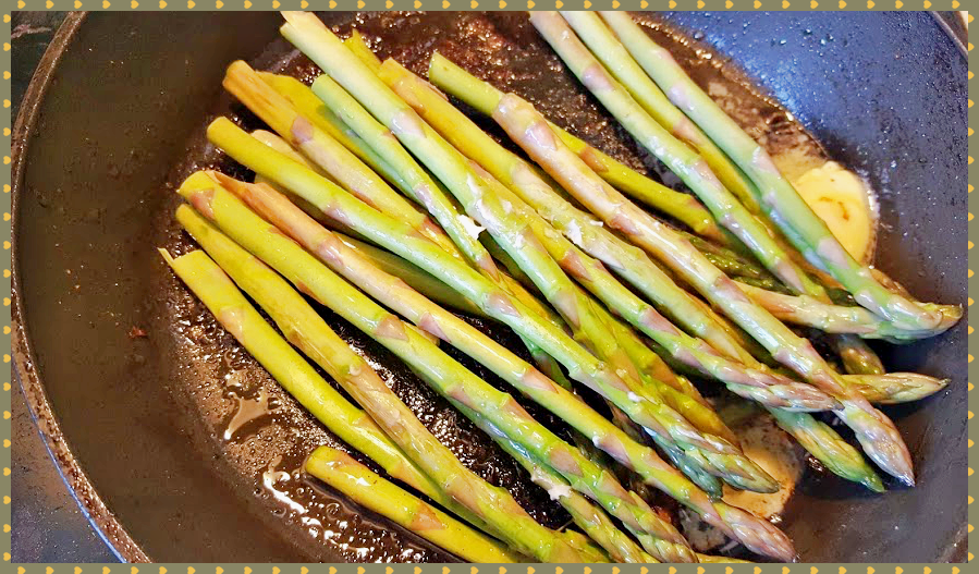 고기가 다익으면 접시에 놓고 후라이팬에 남은 고기 육즙고 기름은 아스파라거스를 조리하는데 사용할거예요. 여기에 풍미를 조금더 살리기 위해 버터 작은스푼을 넣어준후