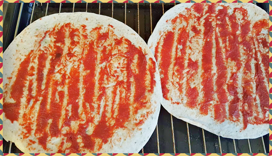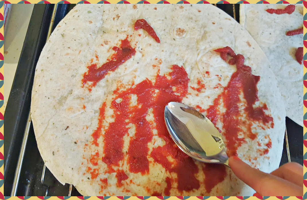 토틸라는 다양하게 쓸수있기에 냉동실에 항상 쟁겨놓고 먹는데 다행이 2개가 남았네요. 토틸라위에 토마토 퓨레를 골고룰 발라줍니다. 아무 토마토 소스나 상관없어요. 너무 많이 바르면 빵이 수분에 젖어 찢어질수 있으니 적당량만 발라주세요.