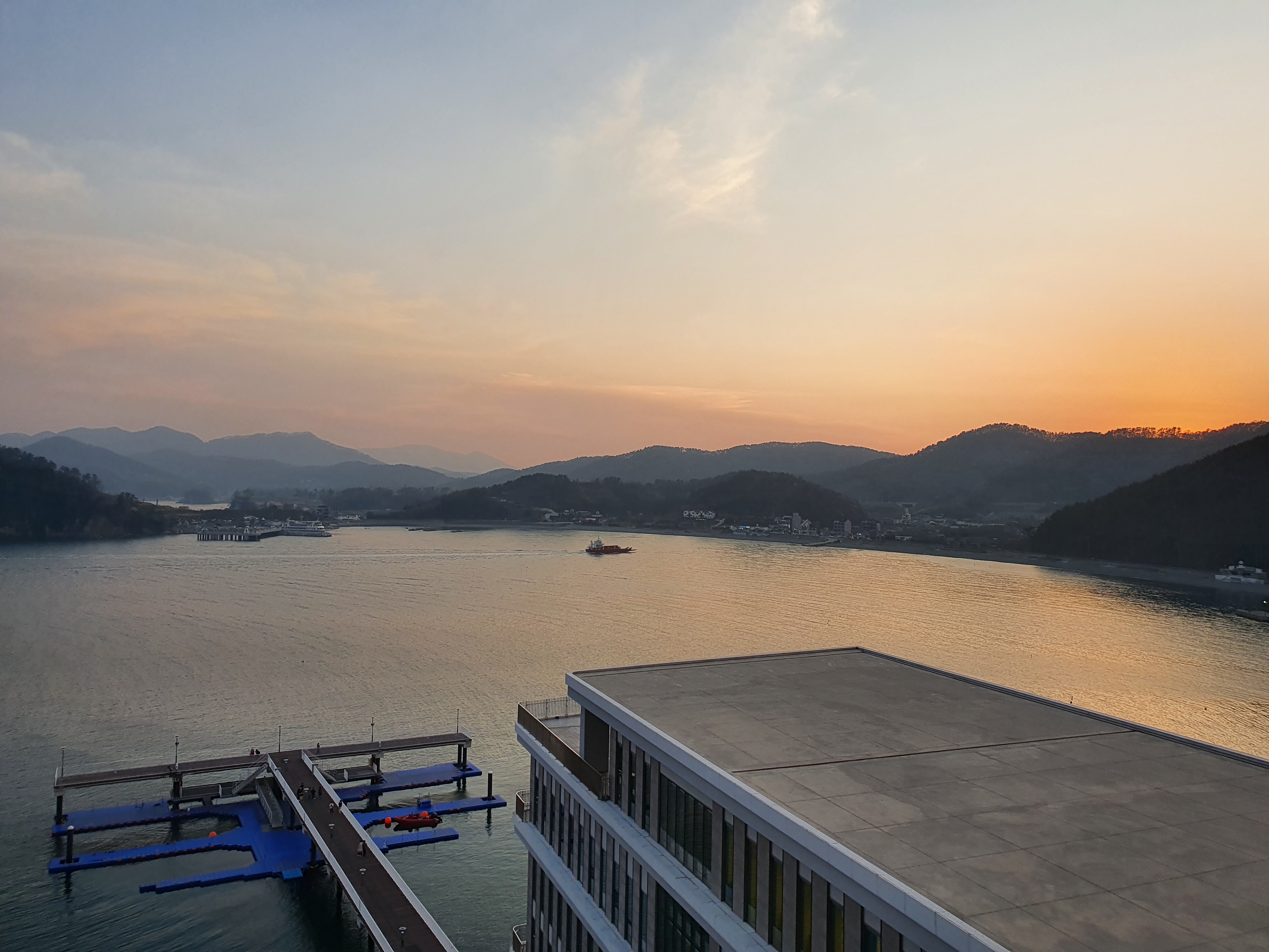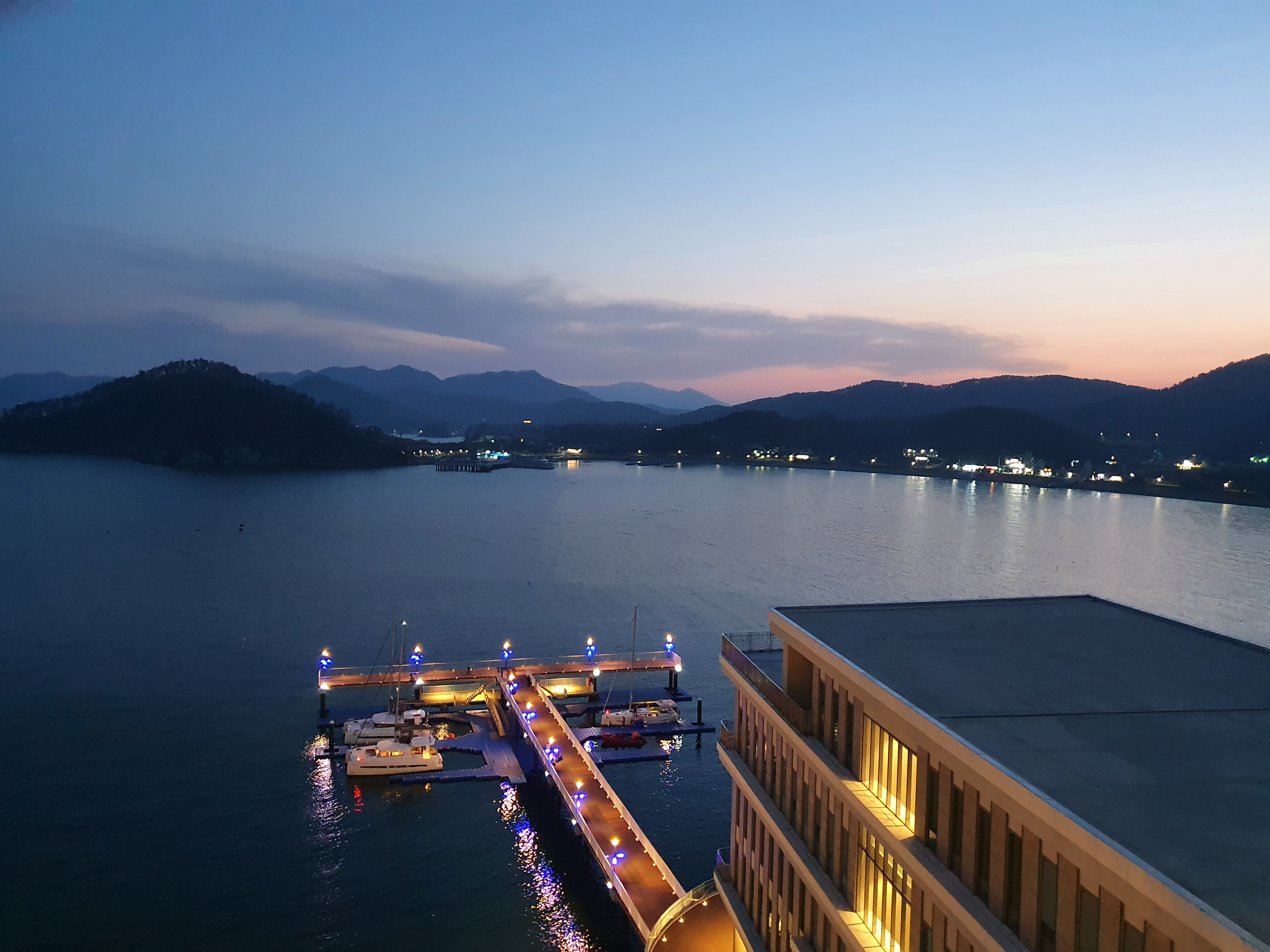 호텔 베란다에선 진한 남해 바다를 볼 수 있다. 마침 도착한 시각에 노을이 지고 있었다. 호텔 푸드 코트에서 음식을 포장해와서 먹었는데, 음식은 맛이 좋고 가격도 합리적이다. 아이들은 육전 물밀면과 갈비탕을 정신없이 흡입했다. 밥을 먹고 바다를 보니, 이번엔 불빛이 물결에 찰랑거렸다. 멋진 방, 멋진 밤이 아닐 수 없다.