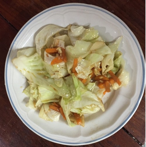 Put the pan on the stove, add oil. When the oil is hot, add the garlic. Stir-fry until fragrant garlic followed by cabbage and carrots.Then put oyster sauce and add a little sugar. Stir-fry enough until the cabbage is almost cooked, then take it out of the pan and put it on a plate ready.