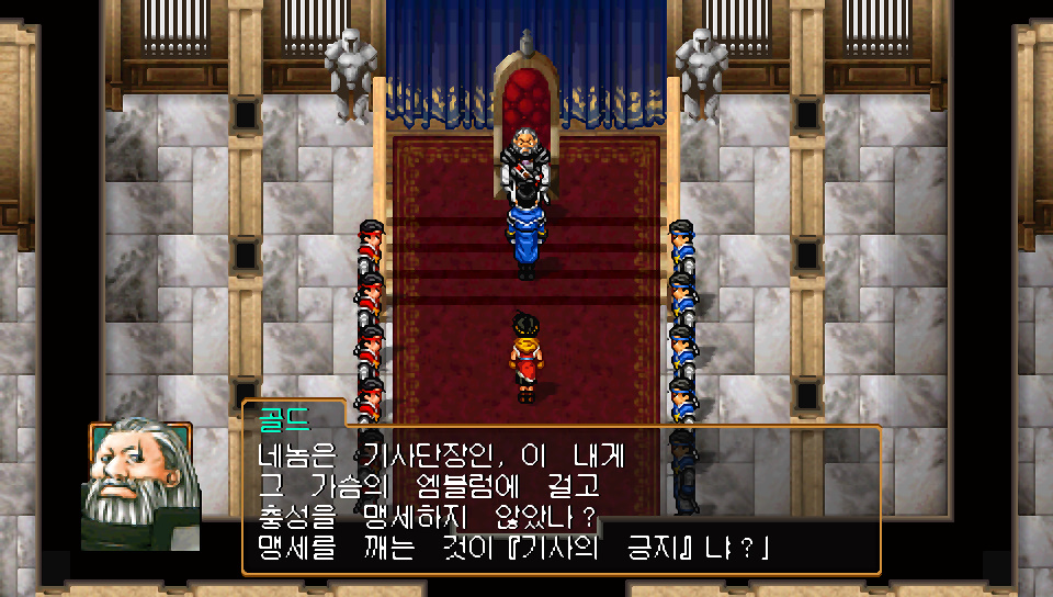 골드 : 닥쳐라!! 네 이놈, [기사의 긍지] 라고 했겠다. 네놈은 기사단장인, 이 내게 그 가슴의 엠블럼에 걸고 충성을 맹세하지 않았나? 맹세를 깨는 것이 [기사의 긍지] 냐?