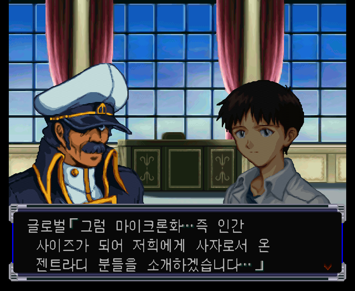유제스 : 네. 그 별은 특이점이라고 해야 할 존재입니다. 저희가 미처 몰랐던 힘이 숨겨졌다고 봐도 틀림없을 겁니다. (...어찌 됐든 프로토 컬쳐의 유적이 현존하고 있을 정도니까... 네르프가 지오프론트라 부르는 그 지하의 대공동... 그것이야말로 선대문명 프로토 컬쳐의 유적... 그리고 [사해문서] 에 기록된 약속의 토지... 진정한 [검은 달] 이 틀림없을 것이다... 그러니 거인들이 그 별을 파괴하게 놔둘 수는 없다...)