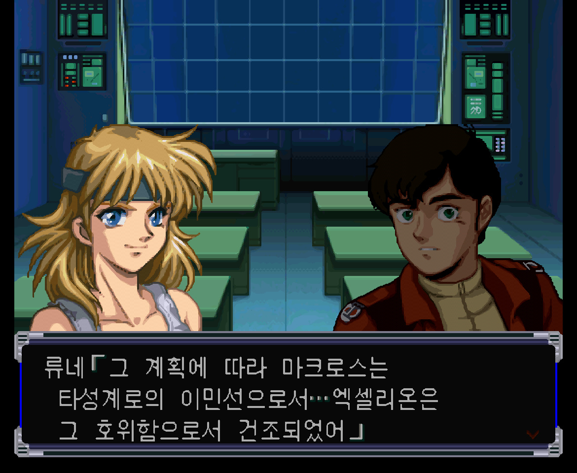 류네 : 그래... 6년 전, EOT 특별심의회가 연방 정부에 제출한 지구 탈출 계획의 핵심이야. 그 계획에 따라 마크로스는 다른 성계로의 이민선으로서... 엑셀리온은 그 호위함으로서 건조되었어.