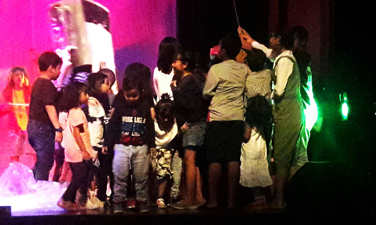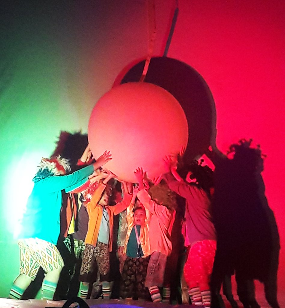 Menarik! Dengan teknik gelombang layar, permainan siluet, gerak tari dan nyanyi, serta tata lampu yang dinamis, pertunjukan itu mengalir cepat. Gembira, mendebarkan, dan lucu. Yang tak terduga adalah keterlibatan penonton anak-anak yang diminta naik ke panggung untuk mengalahkan dua robot pencuri bulan itu.