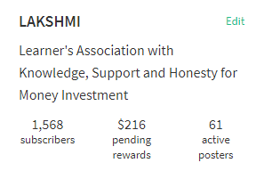 Now we have total 1568 members in LAKSHMI community with $216 pending rewards and 61 active posters. So become a part of this growing community and make your future bright and secure. Our moto is "Wealth and Happiness for All".