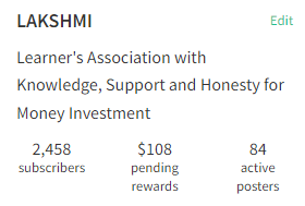 Now we have total 2458 members in LAKSHMI community with $108 pending rewards and 84 active posters. So become a part of this growing community and make your future bright and secure. Our moto is "Wealth and Happiness for All".