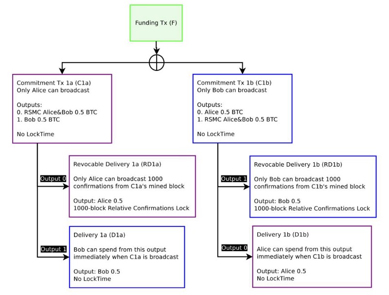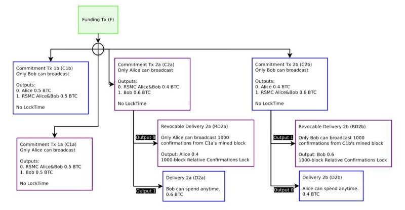 In fact, here is the private key of the multi-signature address corresponding to the RSMC contract. Taking C1a as an example, Bob signed the unsigned transaction of C1a and gave it to Alice, but Bob could not broadcast C1a. Because Alice didn't sign. In other words, only Alice can broadcast the deal. But when the channel status is updated to C2a, Alice does not dare to broadcast C1a, because before updating to C2a, she has to put the private key of RSMC in C1a (another private key) to Bob, and Bob gets the private key. If you see C1a on the Bitcoin network, it means that Alice cheats, Bob can use Alice2 private key in RSMC and his own Bob2 private key to directly take Alice's 0.5 BTC, and Alice has to wait for 1000 blocks to take back 0.5 BTC, Bob broadcasts the trade fair, and the punishment succeeds.