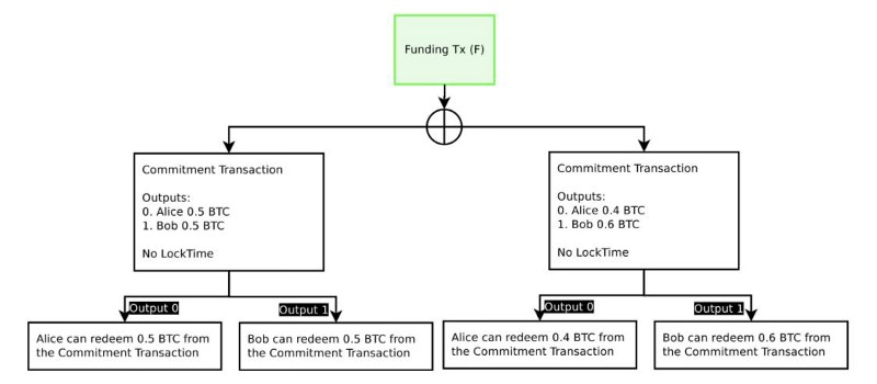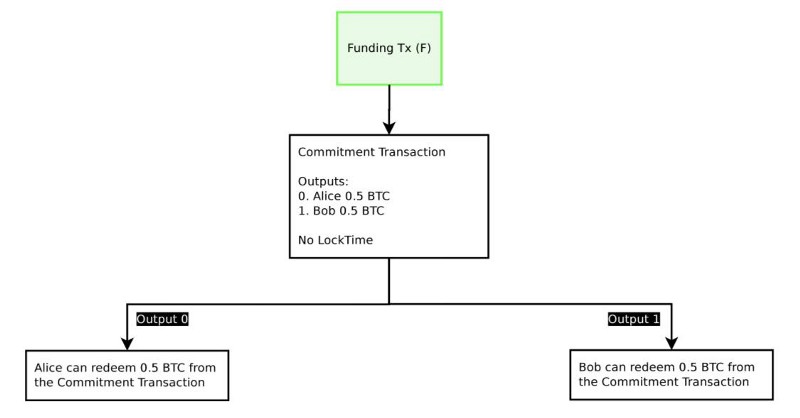 So, we need to prepare a Commitment Tx. Like an unsigned tx on a multisig address for Alice and Bob to withdraw their 0.5 Bitcoin. Because it is a multisig address, means Bob shall sign and send his signature to Alice, also same as Alice. In this way, Alice and Bob both have the ability to withdraw the coins back. Thus, they dont need to worry about any missing or regret from each other. Its better than before.
