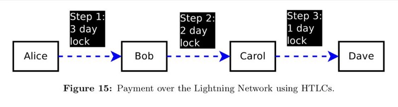 When these agreements are all established, Dave gives R to Carol, gets 0.1 BTC, Carol gives R to Bob, gets 0.101 BTC, and Bob gives R to Alice, in which he sends 0.102 BTC. In the end, Alice pays 0.102 BTC, Dave gets 0.1 BTC, and Bob and Carol get a 0.001 BTC fee.