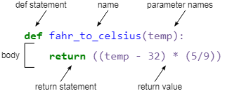 - name - In order to write a python function u have to start the function with the keyword called def followed by the name of the function fahr_to_celsius