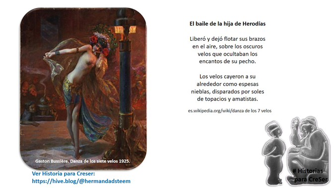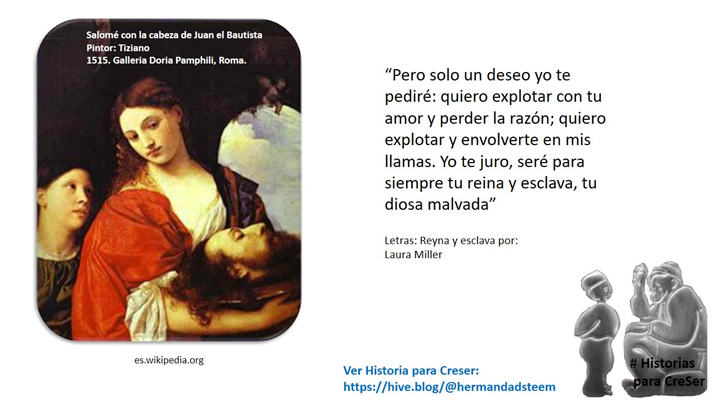 La princesa Salomé es una joven caprichosa, quiso seducir al profeta que estaba encarcelado; pero este no acepto sus lujuriosas pretensiones, pues le podían costar la vida. Por esa época Herodes quién gobernaba cumpliría años y Salomé aconsejada por su madre, quiso rendir un regalo especial al monarca. Preparo la danza de los 7 velos, con toda cautela, pues una venganza crecía en su dignidad de mujer despreciada. Todo salió mejor de lo que esperaba; fueron cayendo sus prendas y Herodes hechizado estaba; -pide lo que quieras ¡grito! Juró darle hasta la mitad del reino-. La princesa y bailarina en la cúspide de su hechizo le dijo al monarca: quiero la cabeza en bandeja de oro del prisionero Juan el Bautista. Respectivamente, la orden de ejecución se llevó a cabo y el deseo de la princesa fue concedido. Ella sellaría su esclavitud por este deseo irresponsable, pues desconocía el fundamento: “El Ser humano es tierra sagrada, y pagarás con tu vida, si atentas contra la vida de tu prójimo”