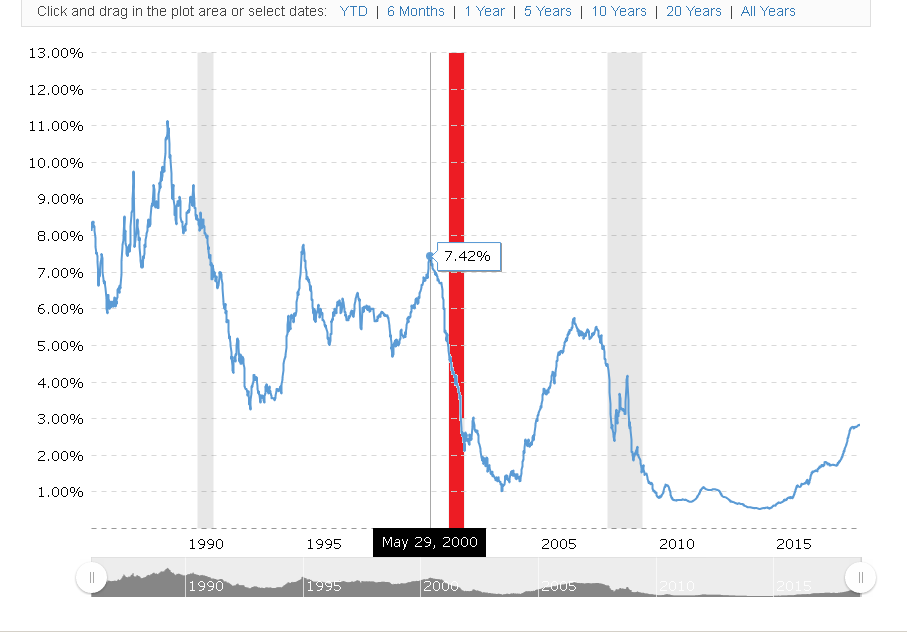 We see the same thing happening in the early 2000 recession with the LIBOR maximum for this period occuring in May 2000 and the Dotcom bust recession following about 9 months later.