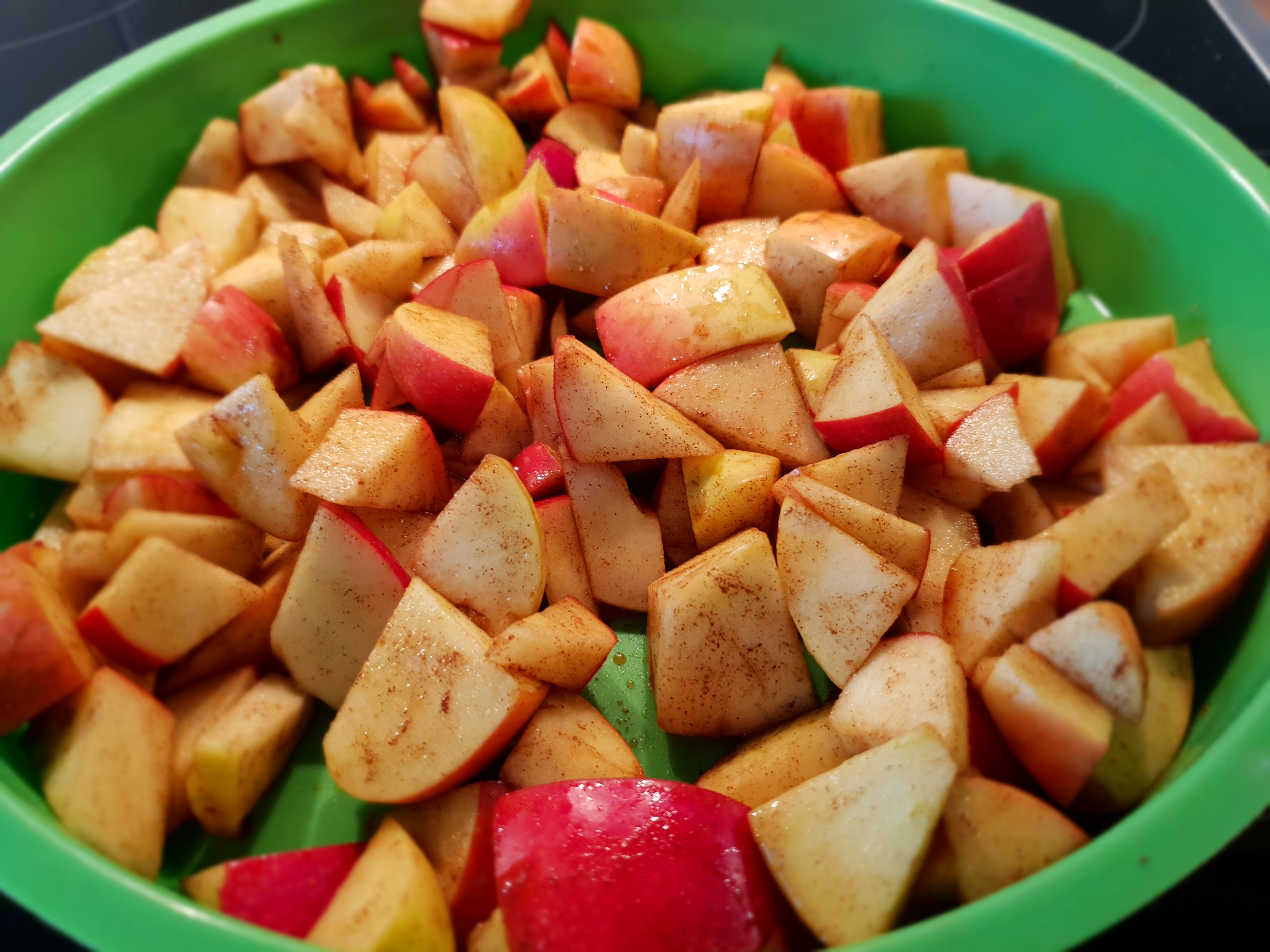 Äpfel gut mit heißem Wasser waschen, das Gehäuse entfernen und in unterschiedlich große Stücke schneiden. In Einer Schüssel mischt ihr die Marinade für die Äpfel zusammen und wendet sie solange darin, bis alle etwas davon abbekommen haben. Auf die Förmchen verteilen.
