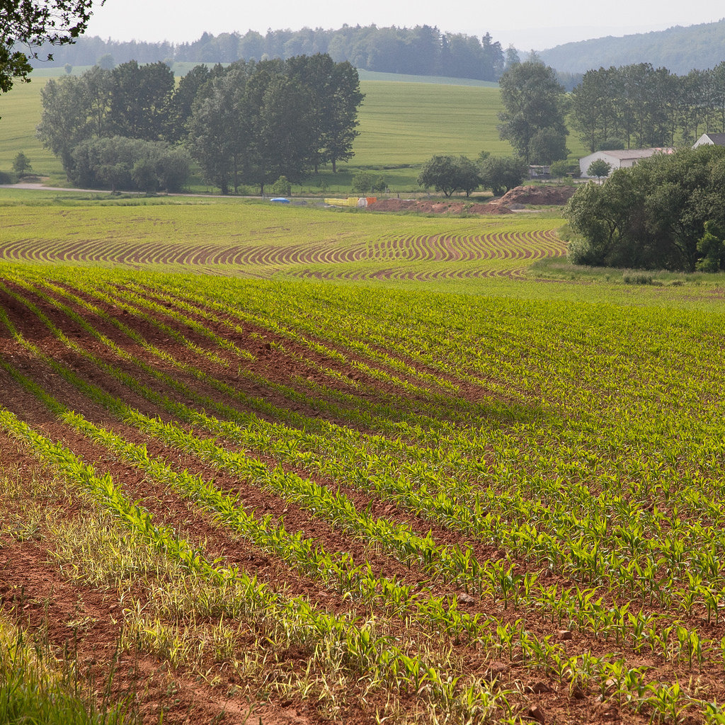 The rows of young corn straight.