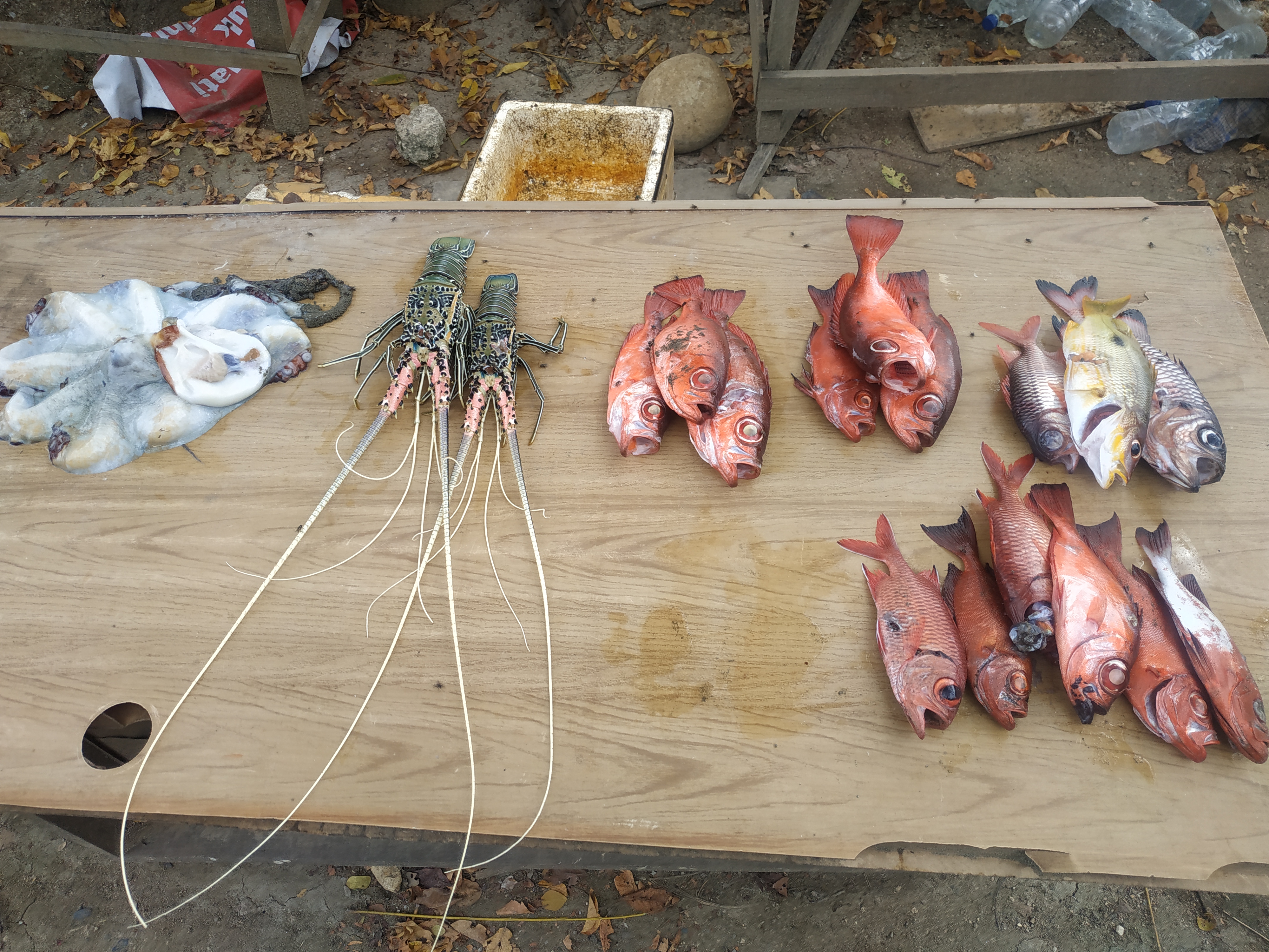 Sore tanggal 27 Desember, setelah mendapat ajakan dari Bang Agus (teman di komunitas smoker spearfishing), saya memutuskan untuk kembali lagi ke Ladong, Ujong kareung dan melakukan spearfishing disana bersama Bang Jhonny. Keadaan cuaca cukup kondusif, air sedikit keruh dan beralun tapi masi bisa untuk hunting. tidak banyak hasil yang saya dapatkan sore (hanya 4 ekor ikan seurendang dan bawal laut yang berukuran kecil) itu karena ikan lumayan liar dan susah di bidik. Jenis ikan yang tampak pun tidak beragam seperti biasa. Hanya ada bawal laut, ikan seurendang yang keluar masuk karang, Dan ikan jenis kakap yang sulit ditangkap. Sedangkan Bang Jhonny sore ini menangkap Beberapa ikan Seurendang, Gurita dan juga Sotong. Gurita dan ikan seurendang dijual kepada orang yang mampir ke lapak jual ikan T.U Azhar di Ladong. Sedangkan sotong saya bantu jualkan kepada teman saya.