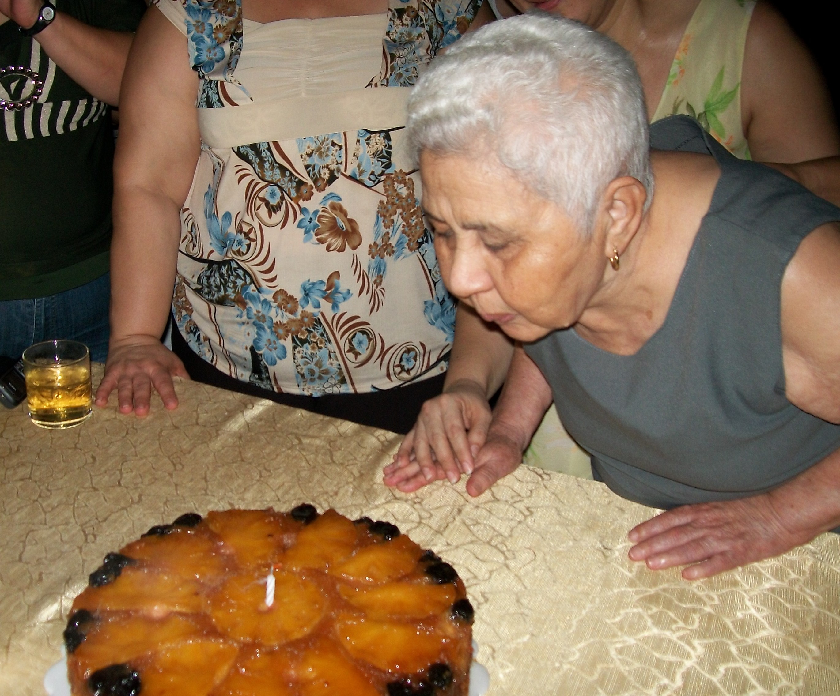 For that night of October 12, 2011, my aunt Magaly had been responsible for preparing the delicious cake that appears in the photo, had a very provocative aspect. It was decorated with pineapple wheels and some raisins. Emida was very happy to have her whole family reunited on that special day for her.