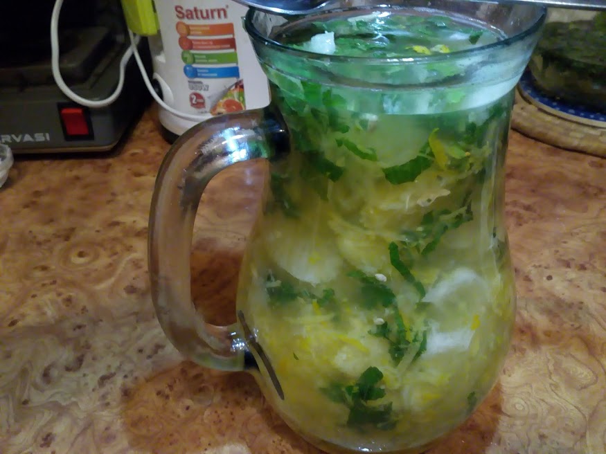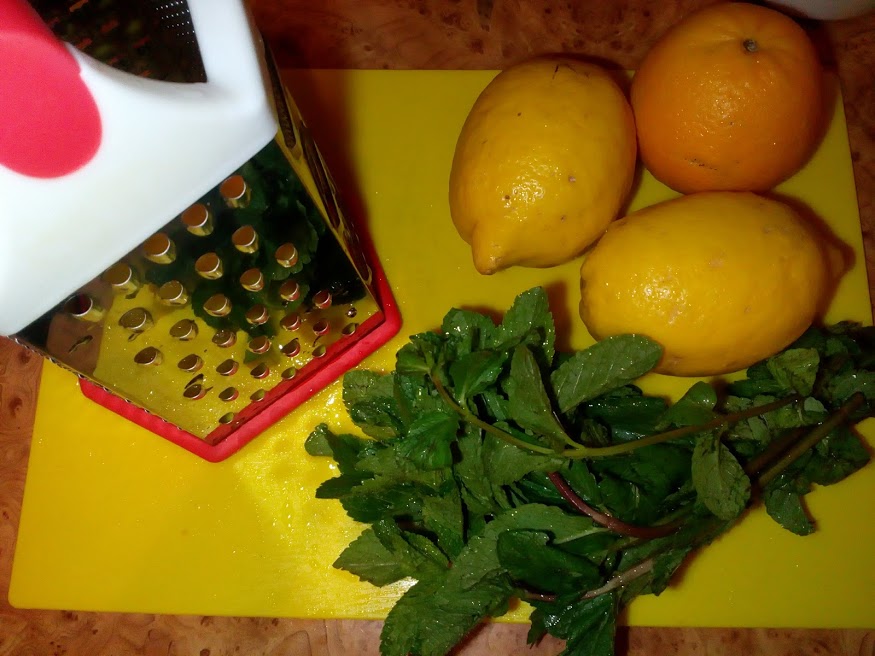 Finely chop the leaves of mint. In the jars, we evenly spread the grated zest, lemon slices, orange and mint. If desired, add sugar. Fill the cans with boiling water. With a long spoon, stir everything. When lemonade in the banks will cool down, then put it in the refrigerator until completely cooled!