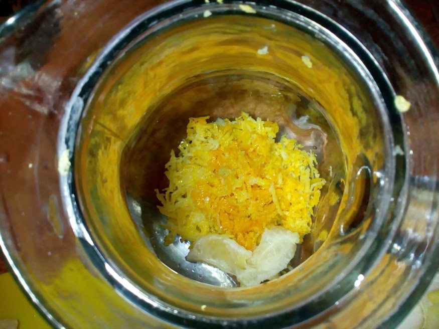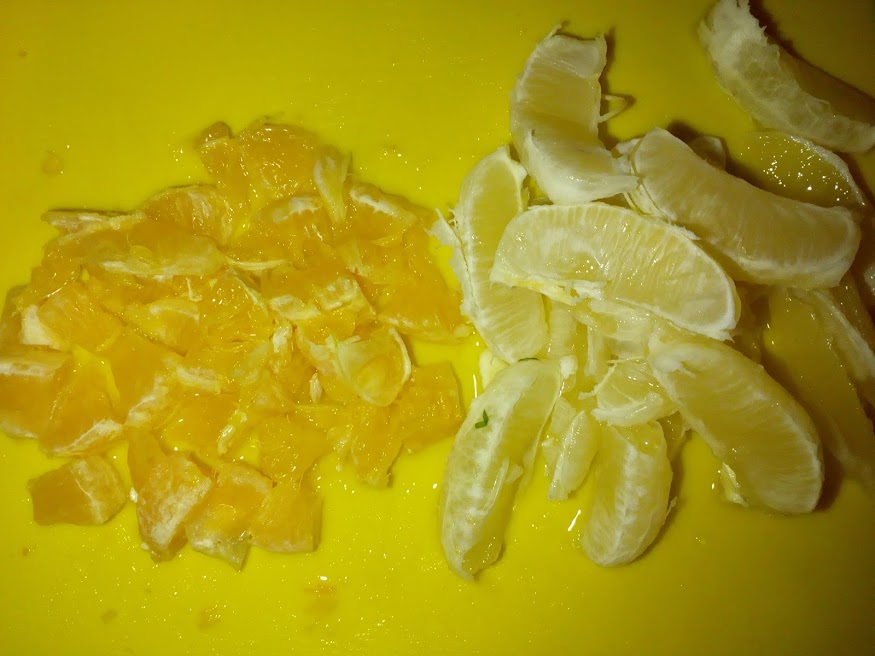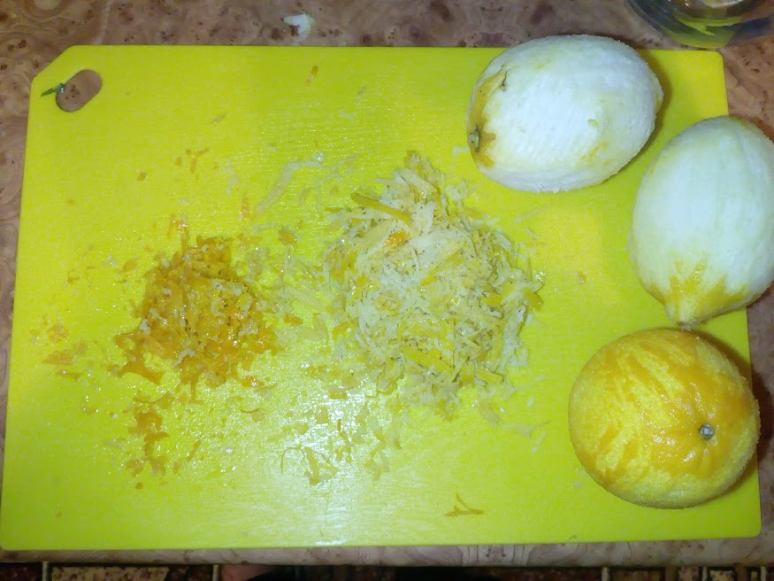 We put water on the fire to make it boil. Lemon and orange peel on a fine grater. Then we clean the citrus fruit from the extra crust. Lemons are divided into slices, we cut the orange into small cubes.