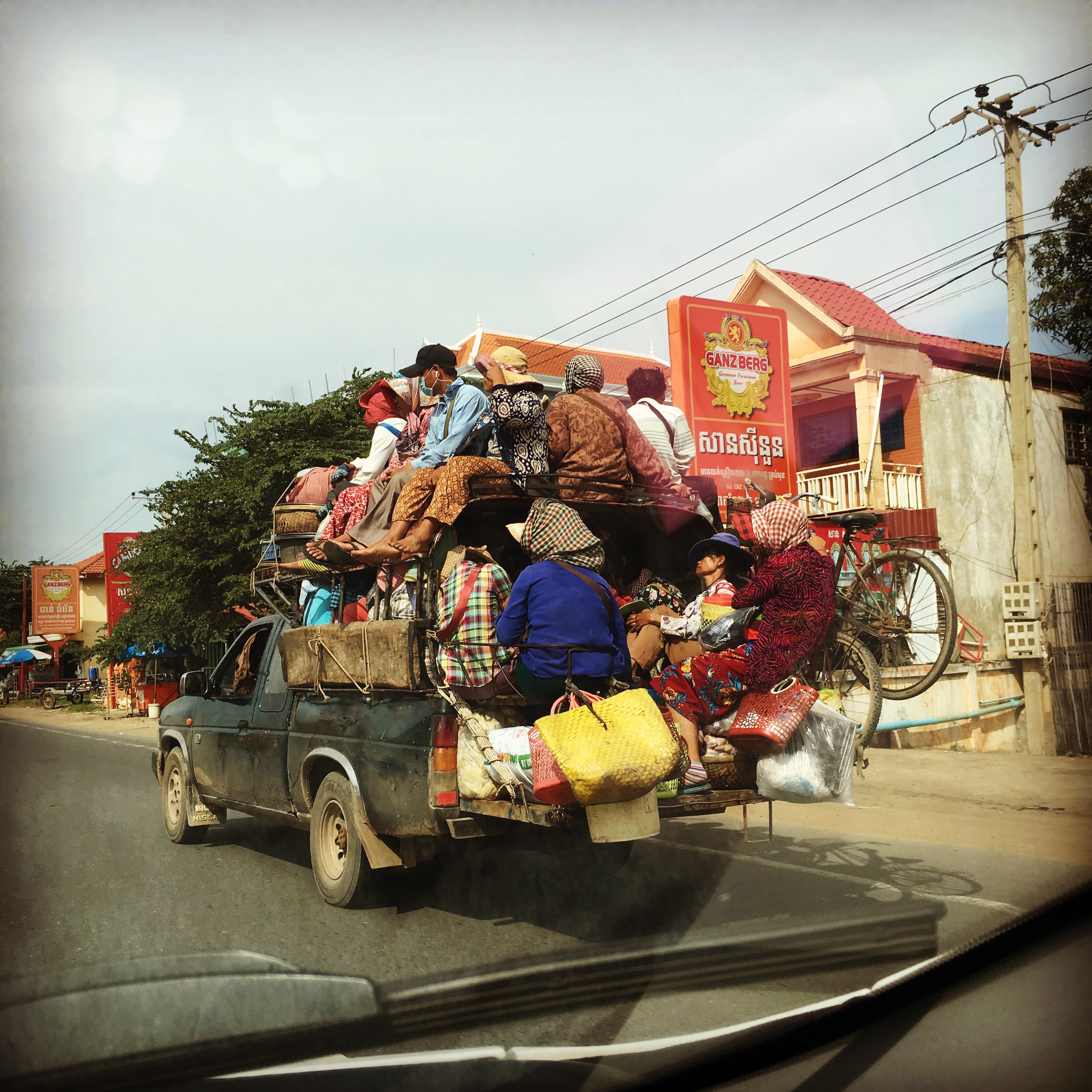 This is how a lot of people travel in Cambodia. Many of them can't afford cars so a lot of them carpool with someone who turns their car into a carpool vehicle. They even managed to fit their bicycles on the truck too.