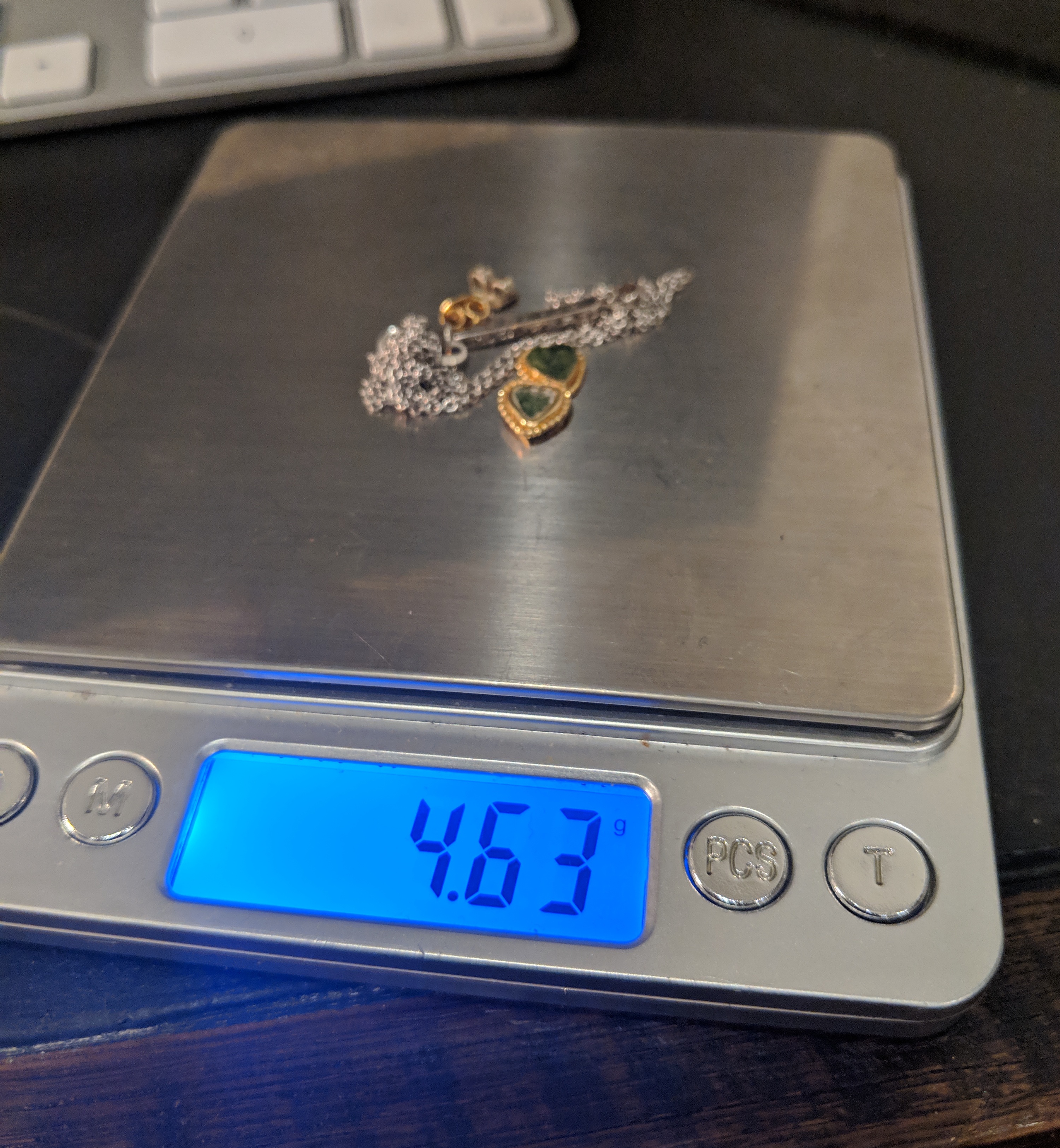14K Gold: I was able to add 4.63g to the stack. Gold Spot Price: $1249.00 oz. Melt value = $108.46