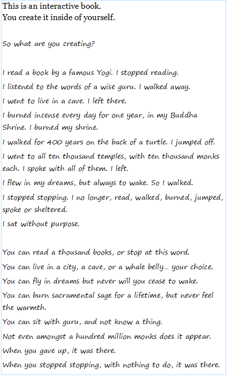 Whatever experiences we are having, we cannot escape the fact that all things can only be experienced within the self. No person can ever experience outside of themselves. The ability to comprehend the world happens exclusively within the being that is observing and interacting with it. The document that is being read here cannot be understood unless the person reading it becomes aware of this particularity of life. They will not appreciate this book unless they become interactive and aware that it is a reflection of their internal mechanism of understanding.