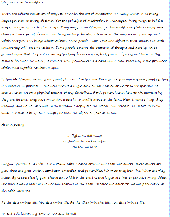 There are many discourses upon the act of meditation. Any of them may be used as a tool to achieve the result. Perfection in meditation is perfection in the mind. This is not given to a person through a book, a manual, or instruction by another person. Rather, these are only tools to shape the careful seeker to become aligned and an adept in practice. The meditation itself comes from the individual and their will and sincere practice.