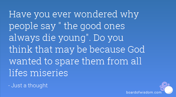 On Friday evening, just as I was stepping out thinking of how my weekend would turn out, I received a call from my dad informing me of the demise of one of the teachers who thought me at high school. I froze! It took almost a minute before I realized I was on the road. This man demystified Organic Chemistry to me and my colleagues in our final year in secondary school. Calm, easy going, humble, gentle and kind to a fault. I'm not saying this because he is late and just have to say sweet things about him. No! He was a really good man who was devoted to his job and to his service to God. Unfortunately he died in his very early forty's, after a brief illness. For three days, there's been a recurring question in my mind: "Why do good people die young?"