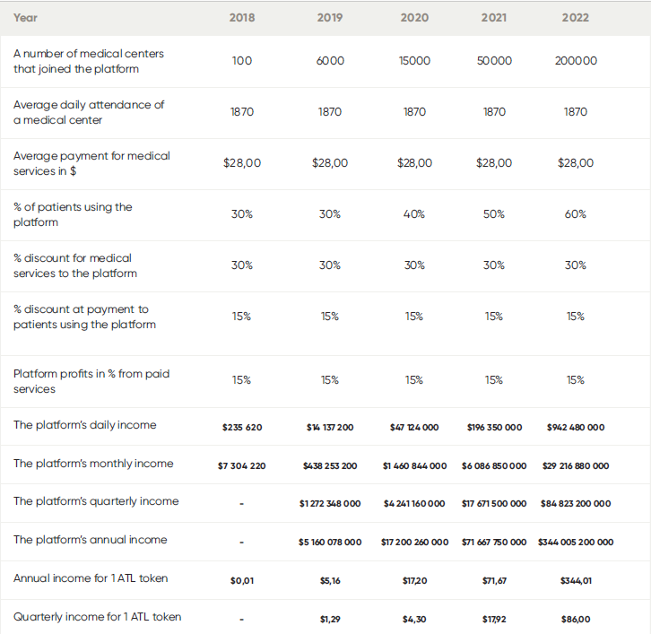 To guarantee a continued participation of the medical, pharmaceutical, and insurance sectors; and ensure continued user patronage of the platform; the participants will be paid bonuses in ATL Tokens for their participation, alongside a stable dividend for the partners. This is outside the normal service and product costs, which are solely for the participants.