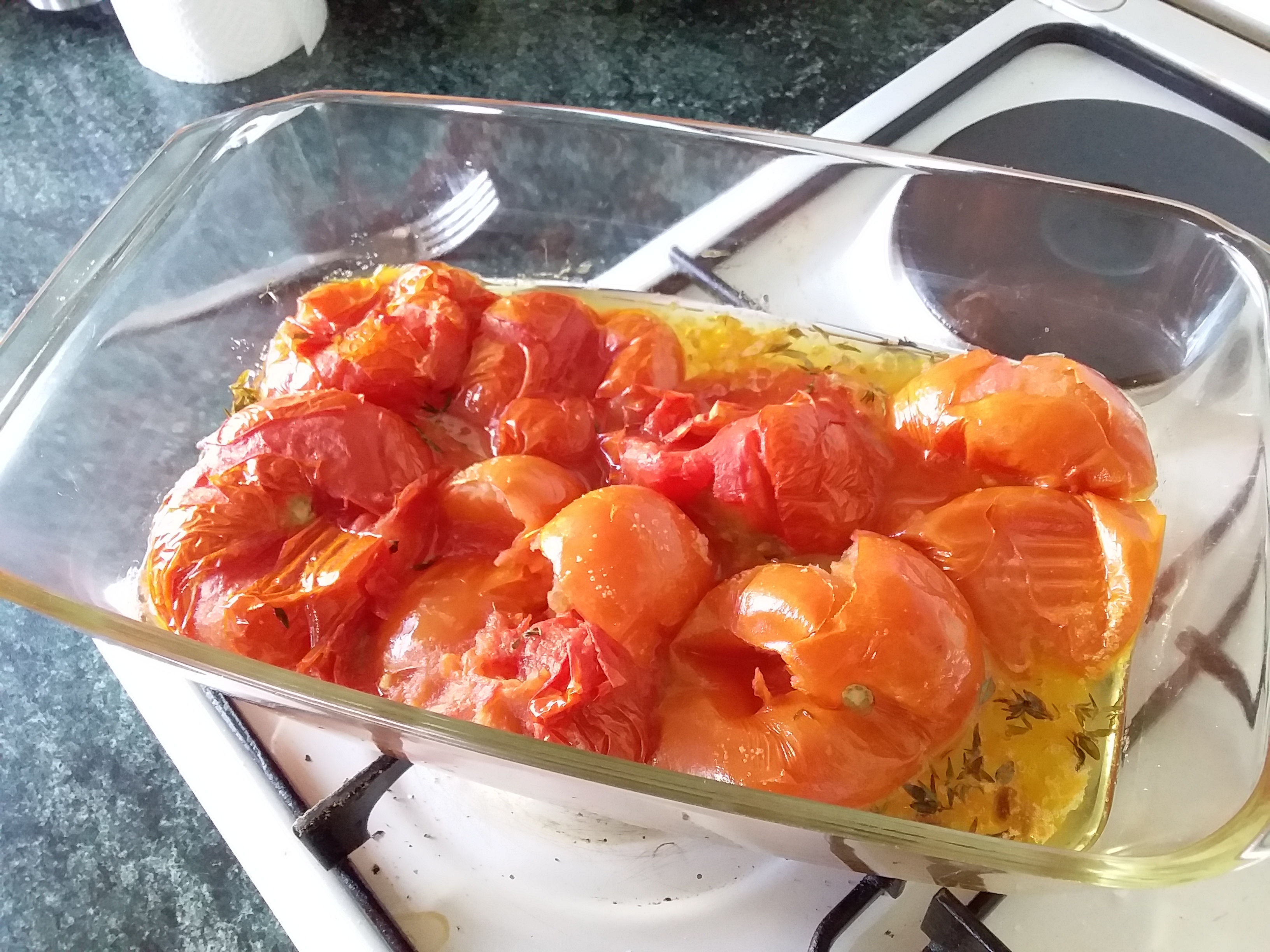 Put your tomatoes into a large oven safe dish/tray and add in all the other ingredients. Preheat your oven to 160 degrees, and put the dish into the oven. Roast for 45 minutes to an hour, turn off the oven, mash the content of the dish (with a fork or a potato masher), and put back into the over for another 15 minutes (the residual heat will help soften it a bit more).