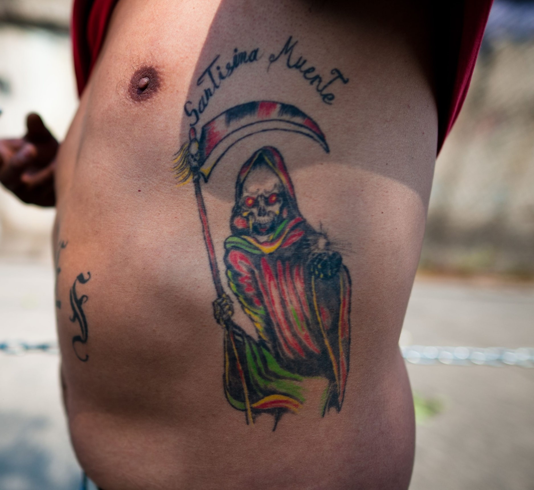 En eso se para un sujeto en la puerta moreno, portando una camiseta blanca percudida, con el pelo engelado y con un tatuaje chocarrero de la santa muerte en el brazo.