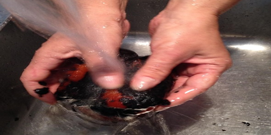 We will extinguish the fire and put each paprika under the tap. The water and the rubbing of our fingers will make the burned skin come off easily.