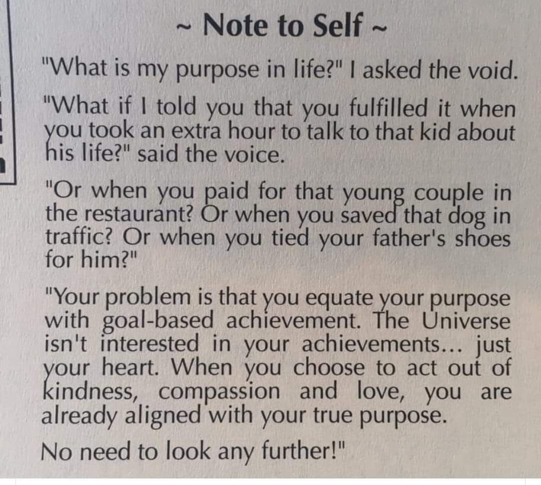 Purpose is important. It’s what gets you up in the morning and helps you stay positive during adversity. It’s something to work for and to hope for. The other day a friend of mine posted this on Facebook: