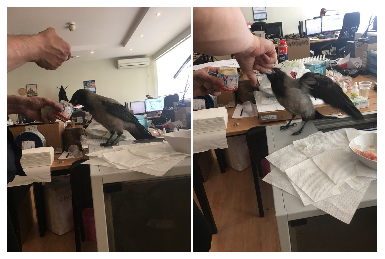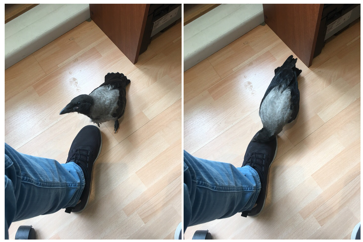 It turns out crows are very sociable and in their own way, cute. Walking around the office, he constantly comes to my chair and again begins to bite the laces, as in our first meeting. Yesterday he flew on my shoulder, when I was working intently with headphones...my heart almost jumped out.
