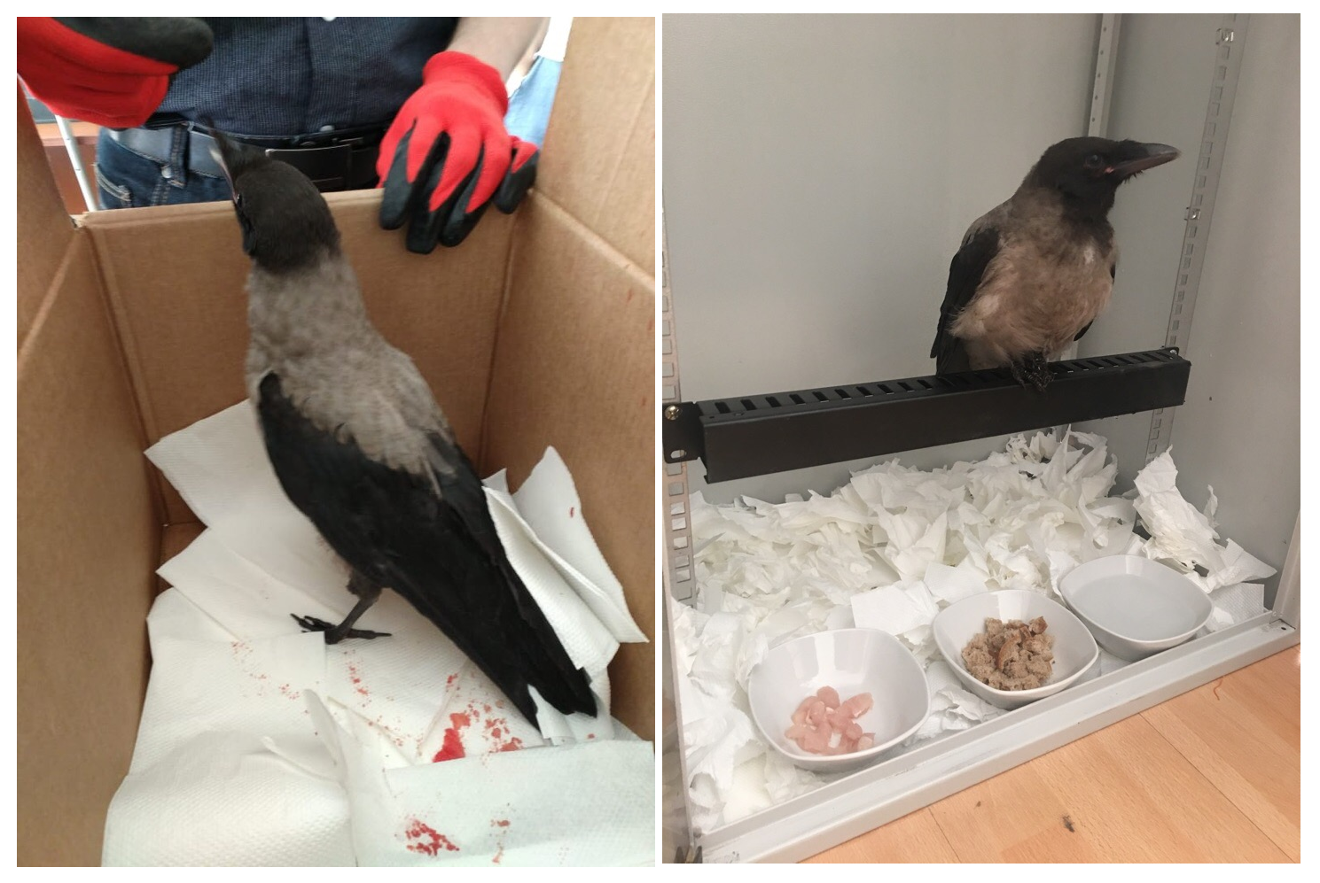 I couldn't find something like a crow's nest nearby, didn't notice other crows at all. After waiting for about half an hour, I made a strong-willed decision to take him to the office, because his paw began to bleed heavily.