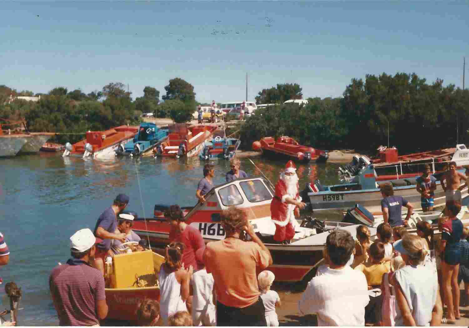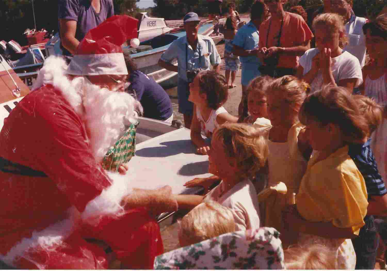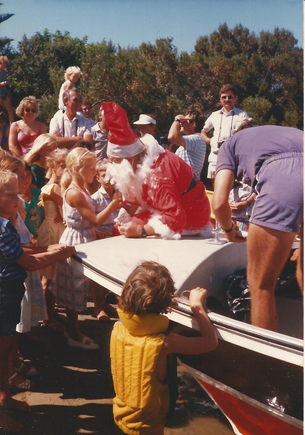 Every year on Boxing Day (24th December) in St Francis Bay, Eastern Cape, the local Station 21 of the National Sea Rescue Institute hosts Father Christmas. He arrives by boat at a predetermined spot on the canals at Marina Glades with bags full of presents for the kids! These presents are delivered to the NSRI boathouse the day before by parents who give a donation to sea rescue.