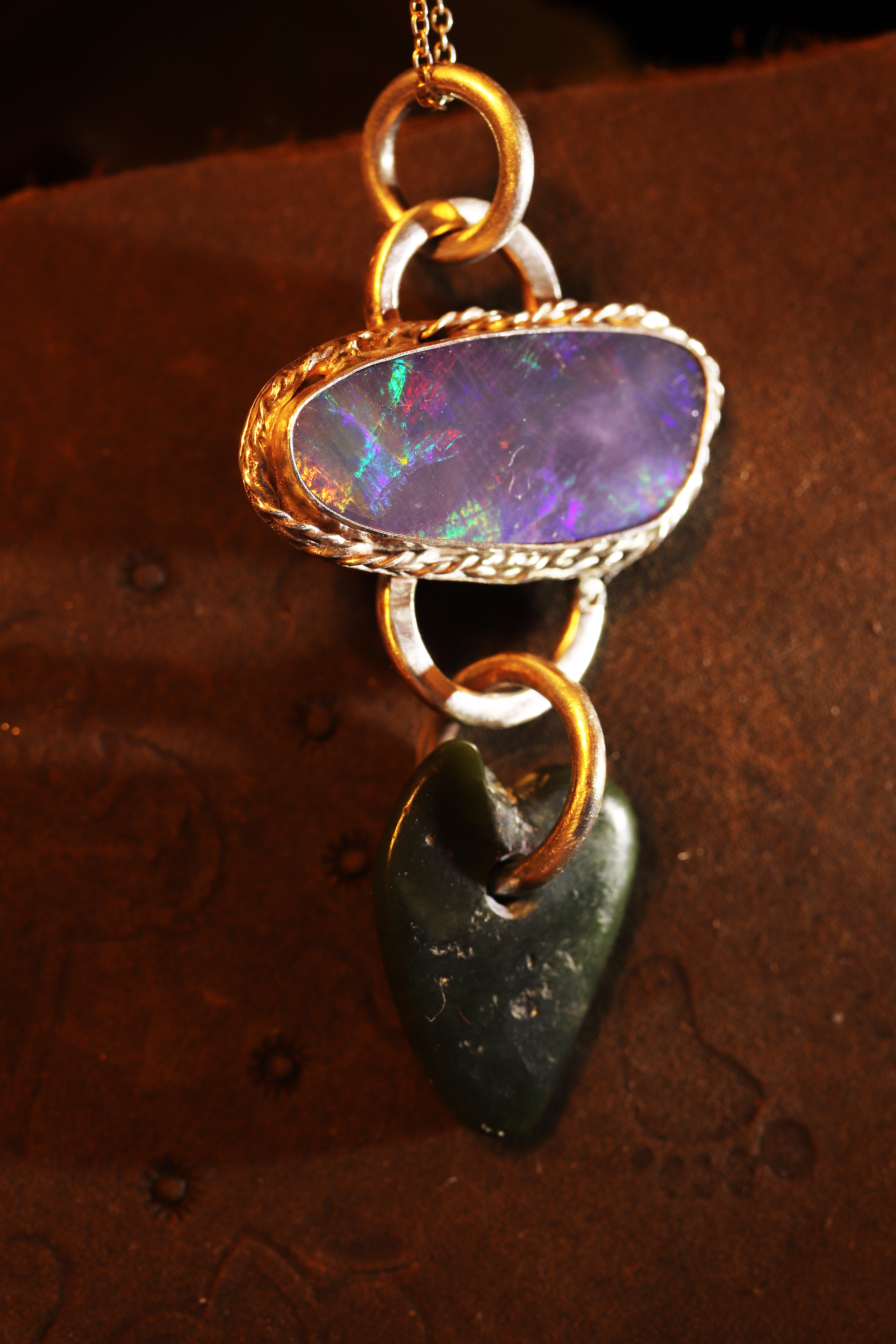The Australian opal has a gorgeous blue red and green flash. The jade I found free diving in the ocean off of Big Sur, the heart shape was naturally formed that way via erosion. I didn't do any carving on it.