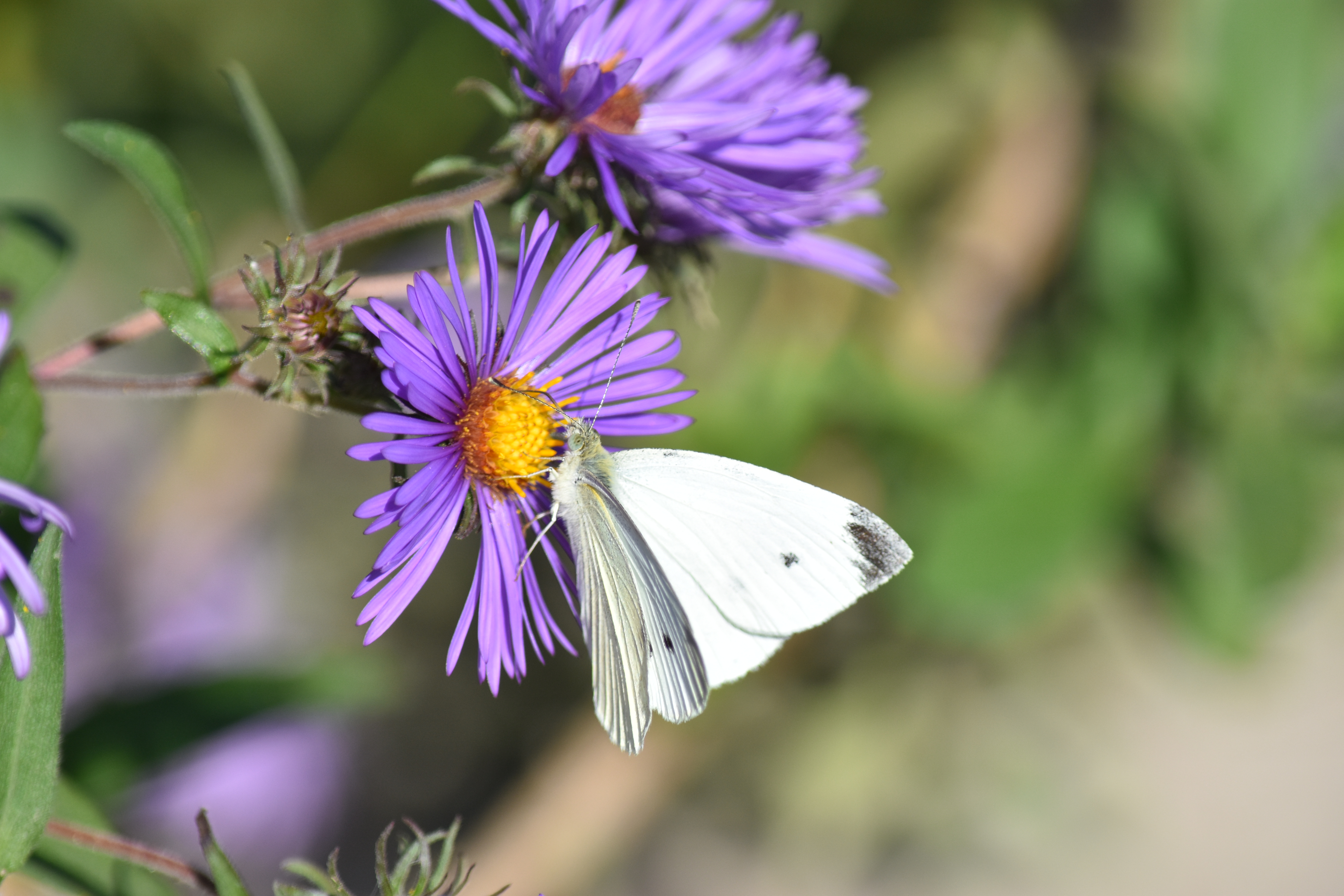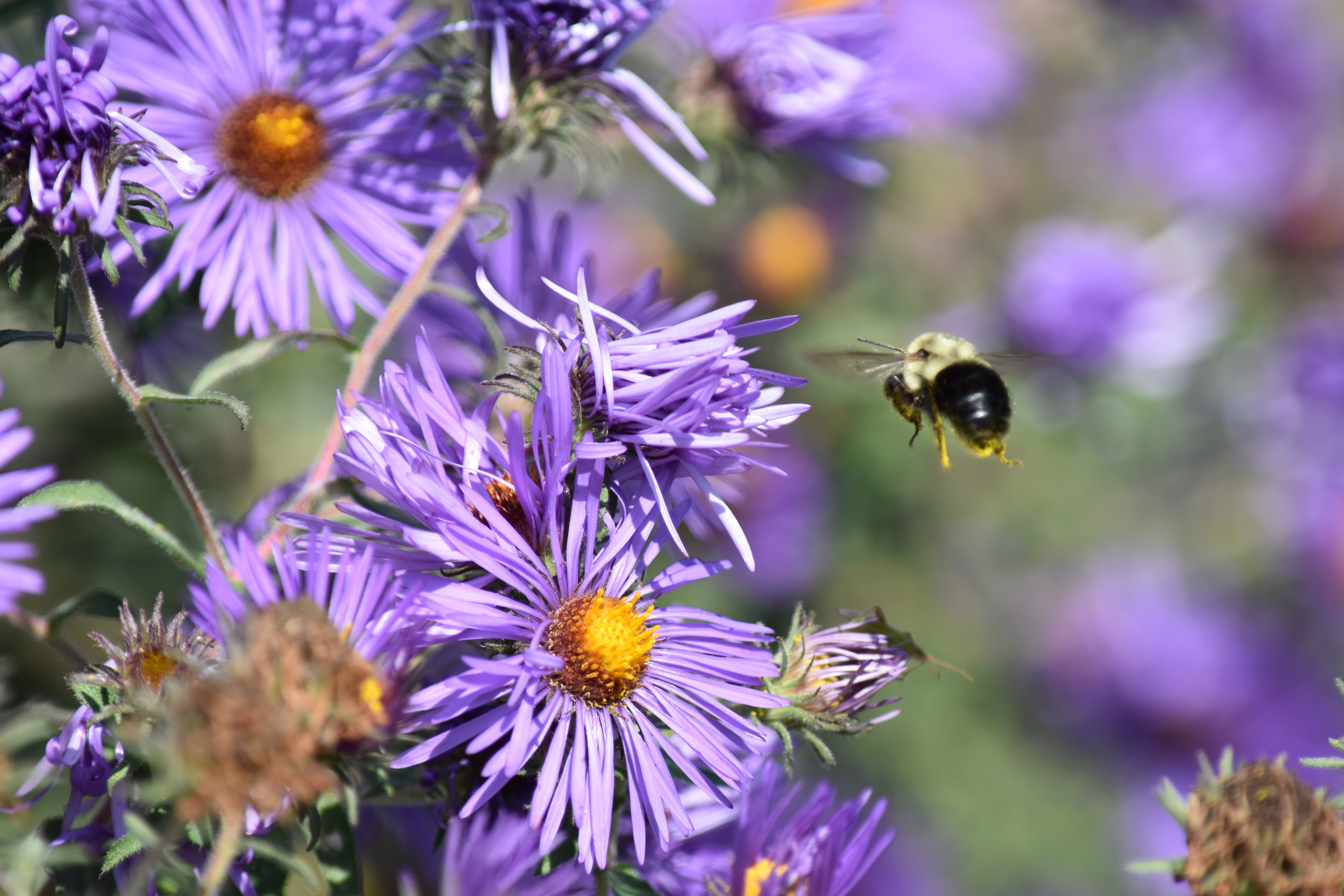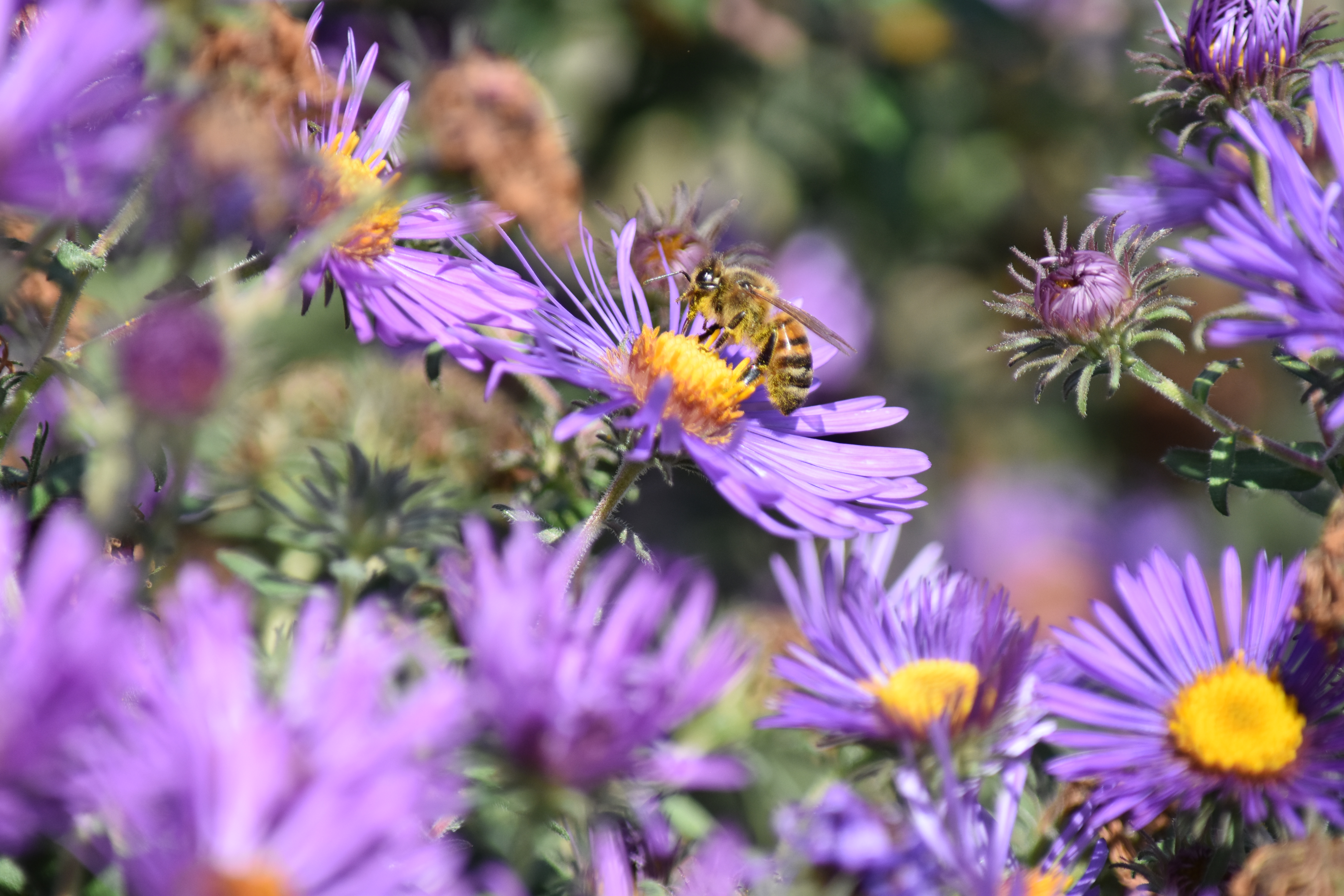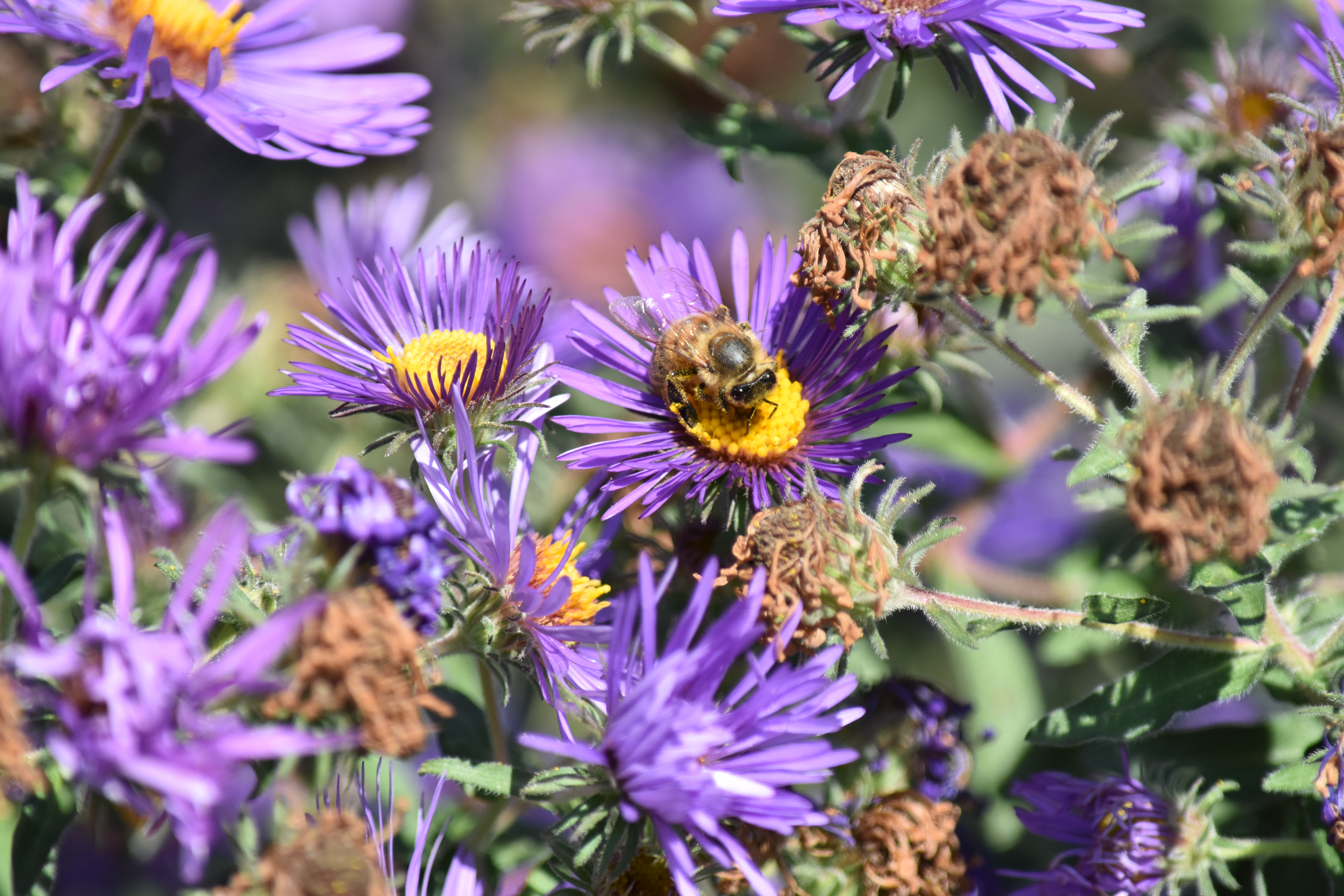 I went back to my Asters today to try and get a better shot of a bee. I figured out how the focusing works and that helped a lot! I like this picture of the flowers because it shows old flowers and new. A plant grows what it needs and then lets what it no longer needs die. I think there's a lesson somewhere in there...