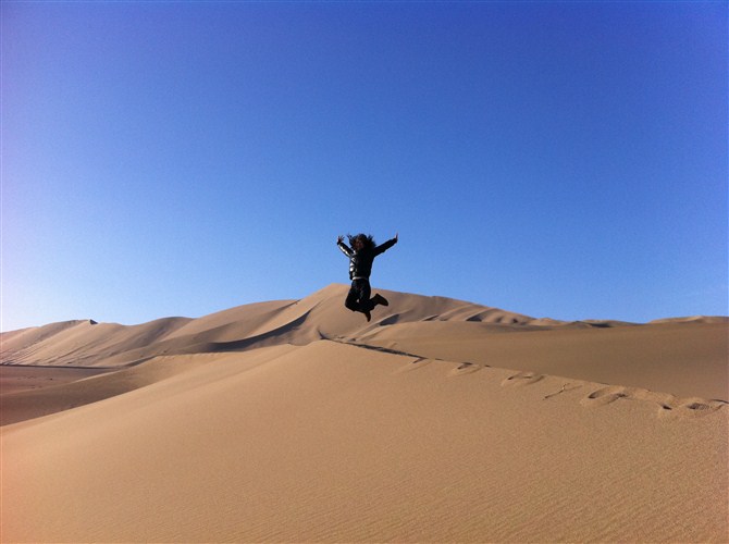 Just about 1 hour and a half's ride by camel, we arrived at the no man's land. It's really beyond my imagination, so beautiful, just like paintings! I always like the feeling of north western China, which is so wide open! A jump can represent my feelings, which is awesome!