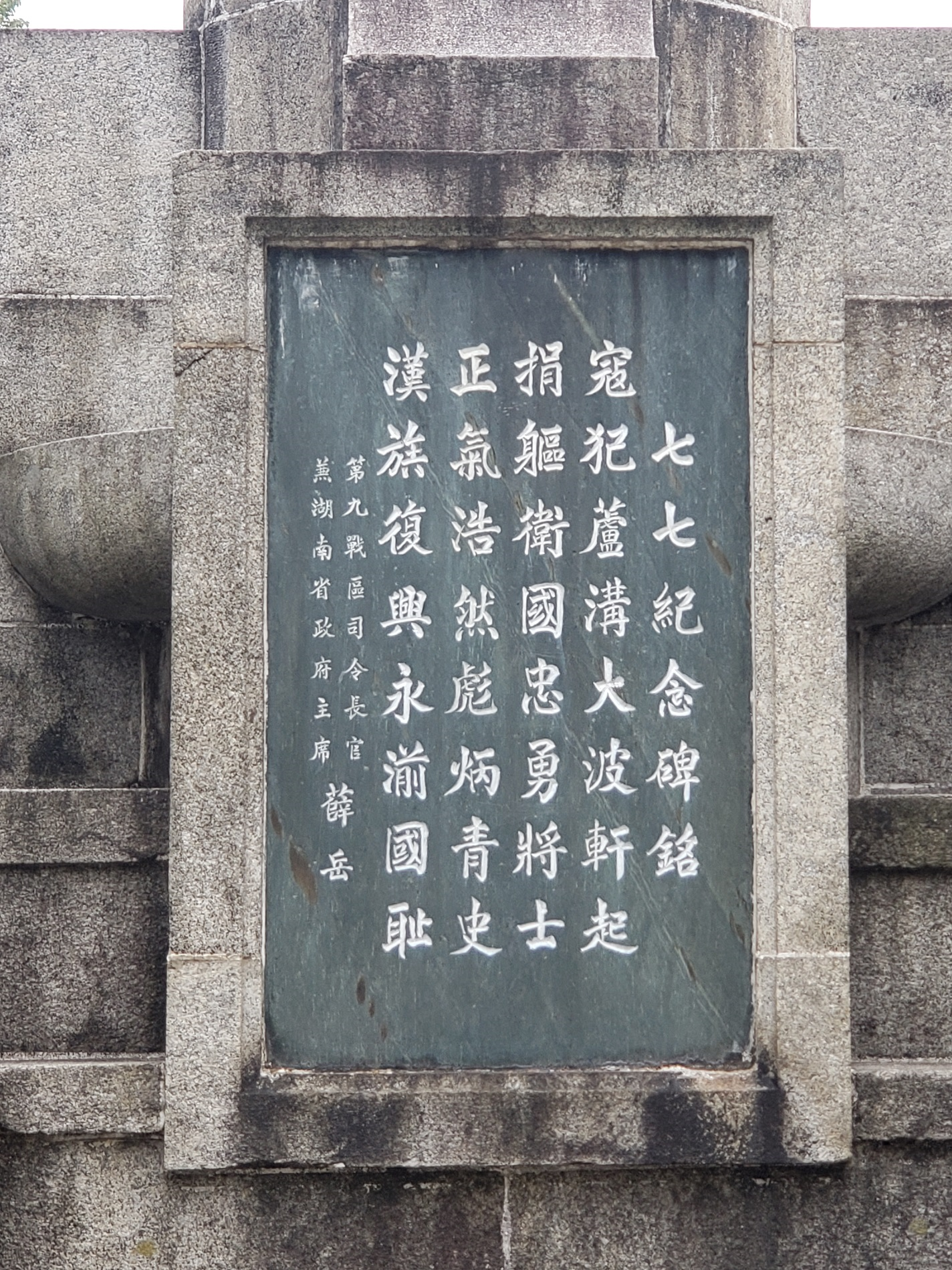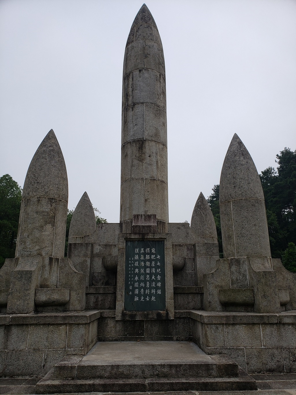 紀念塔由花崗岩築成五枚炮彈的造型,象征漢滿蒙回藏五族頑強團結的精神