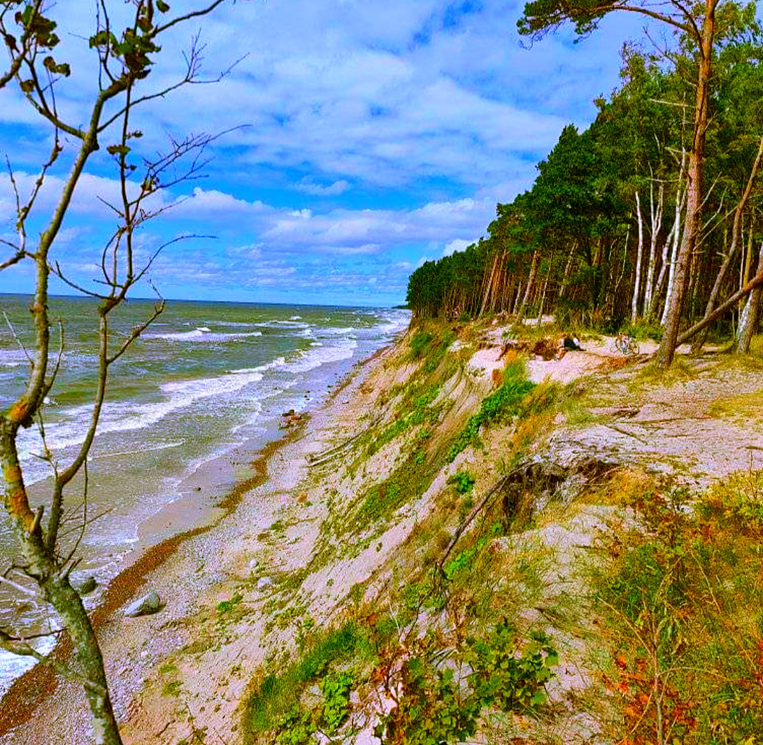 The outcrops of the cliff looked like a living watercolor of the Earth's history, and the trunks of trees temporarily frozen in flight to the sea seemed to dance and cross like the legs of gigantic ballerinas.