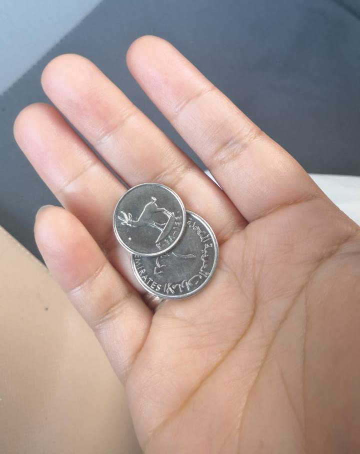 Yesterday before I left the office to go home, I first grabbed 1.50 AED from my boss's office to buy bread for tomorrow. I put it in my pants pocket. This morning, when my wife was driving me to the office, I got out of the car, I didn't realize that my coin had fallen into my pocket.