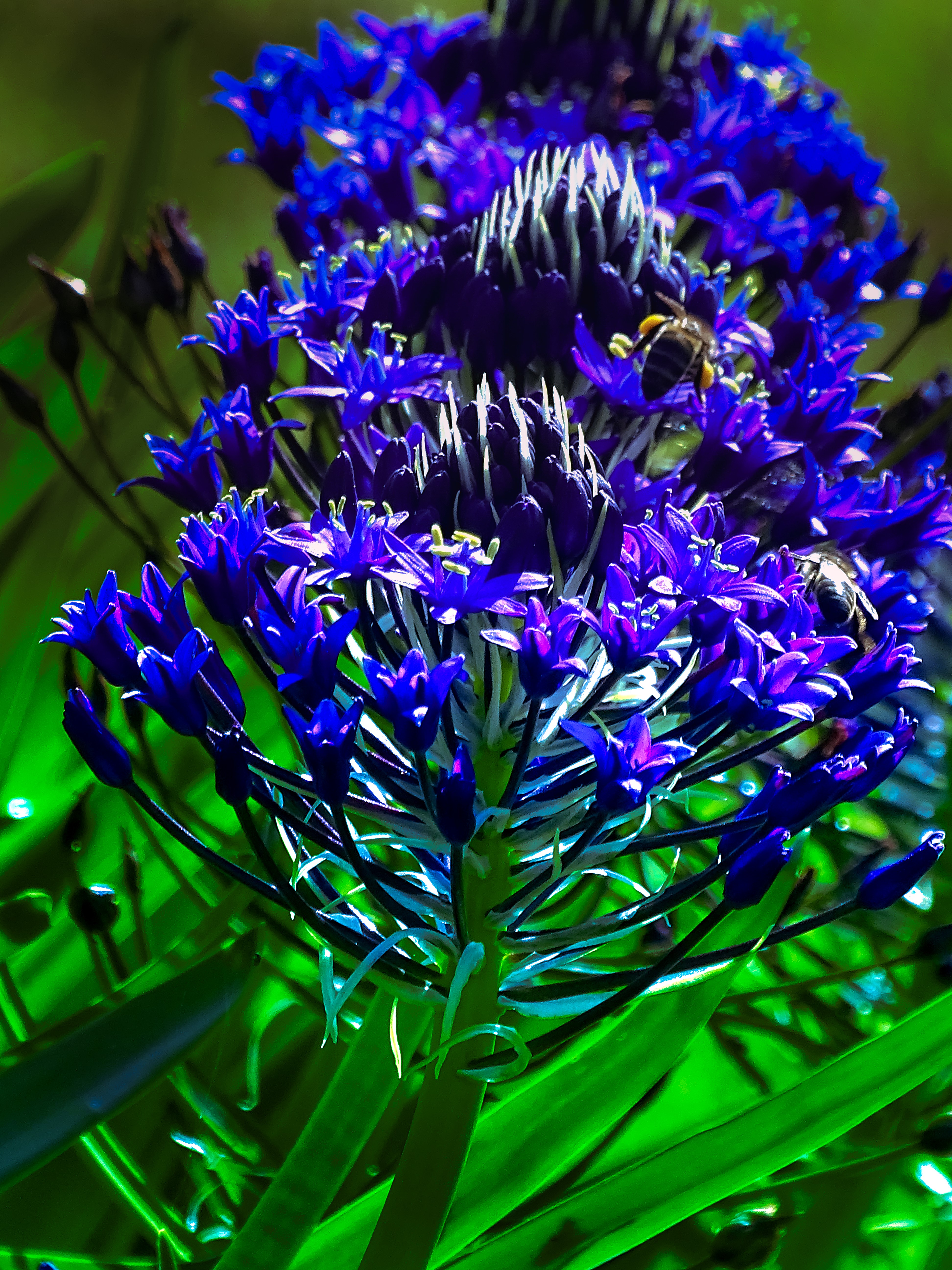 It is a bulb-bearing herbaceous perennial plant. The bulb is 6–8 cm diameter, white with a covering of brown scales. The leaves are linear, 20–60 cm long and 1–4 cm broad, with 5-15 leaves produced each spring. The flowering stem is 15–40 cm tall, bearing a dense pyramidal raceme of 40-100 flowers; each flower is blue, 1–2 cm diameter, with six tepals.