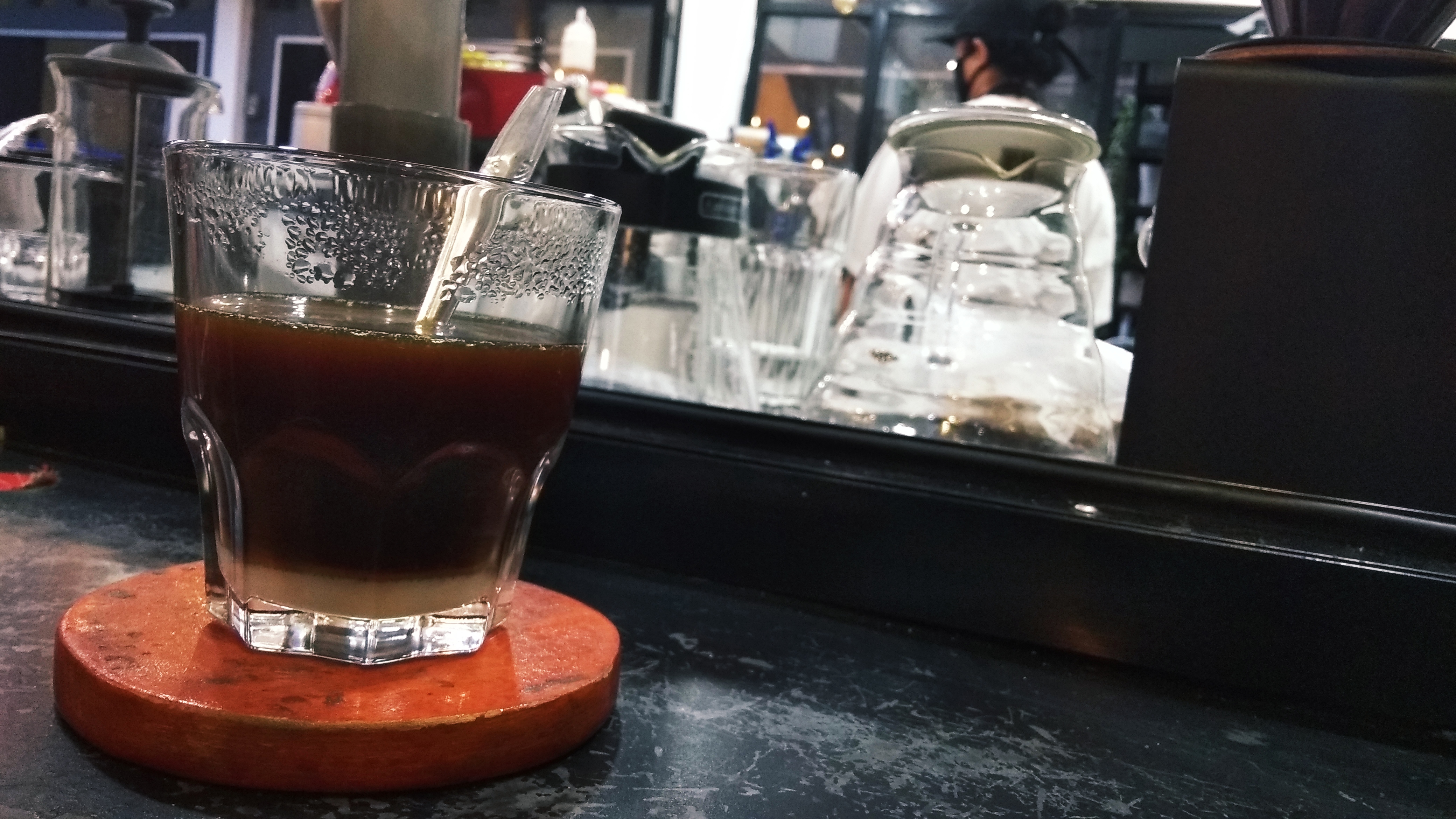 Setelah berucap terimakasih kepada pak supir, aku turun dan berjalan dalam keinginan yang belum kesampaian. Alhamdulillah, beberapa langkah lagi aku sudah di depan meja barista. Rokok sisa kusulut kembali beriring dengan pramusaji datang membawa daftar menu. Usai membolak-balik menu, aku pun memilih vietnam drip. Awalnya aku ingin memesan black americano saja, namun entah kenapa tiba-tiba pesanan berubah. Aku sedikit linglung.