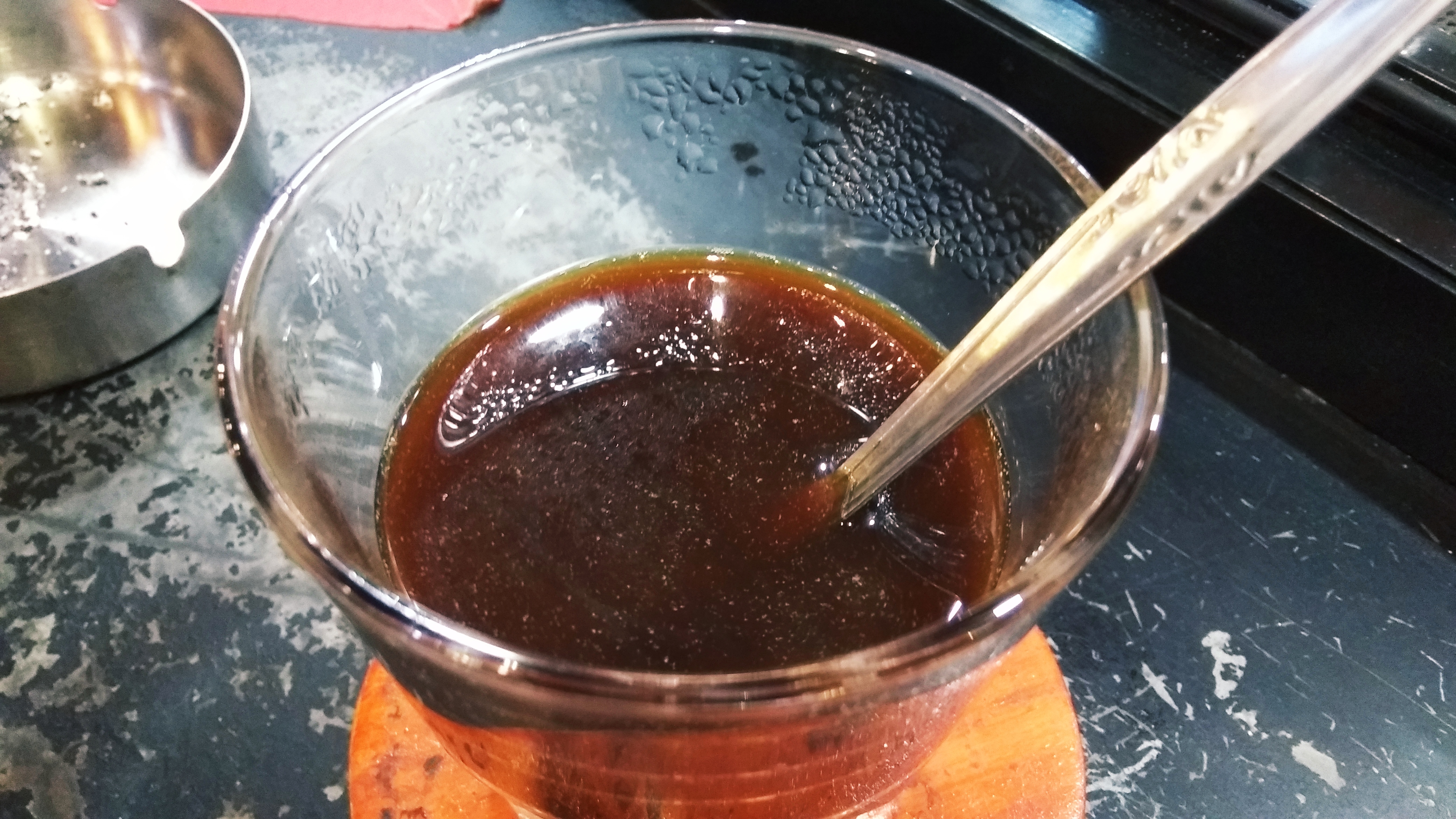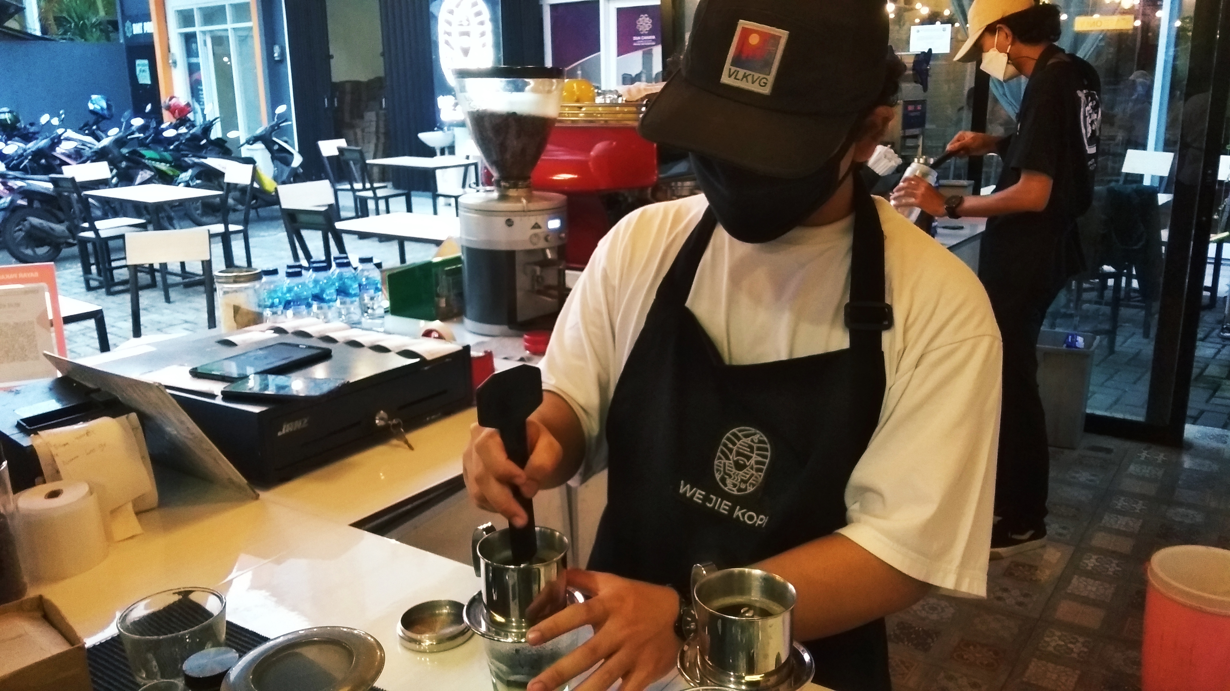 Karena sebelumnya aku tidak pernah memesan vietnam drip, aku pun sedikit menyesal. Soalnya, selain membutuhkan waktu lebih lama karena menunggu tetes demi tetes kopi turun ke gelas, pesanan ini pun ditambahkan sedikit susu. Di awal, saat aku melihat barista menuang susu, aku langsung sanggah agar barista mengurangi susunya. Aku minta sesendok saja. Aku minta demikian karena tidak mungkin lagi aku mengganti pesanan.