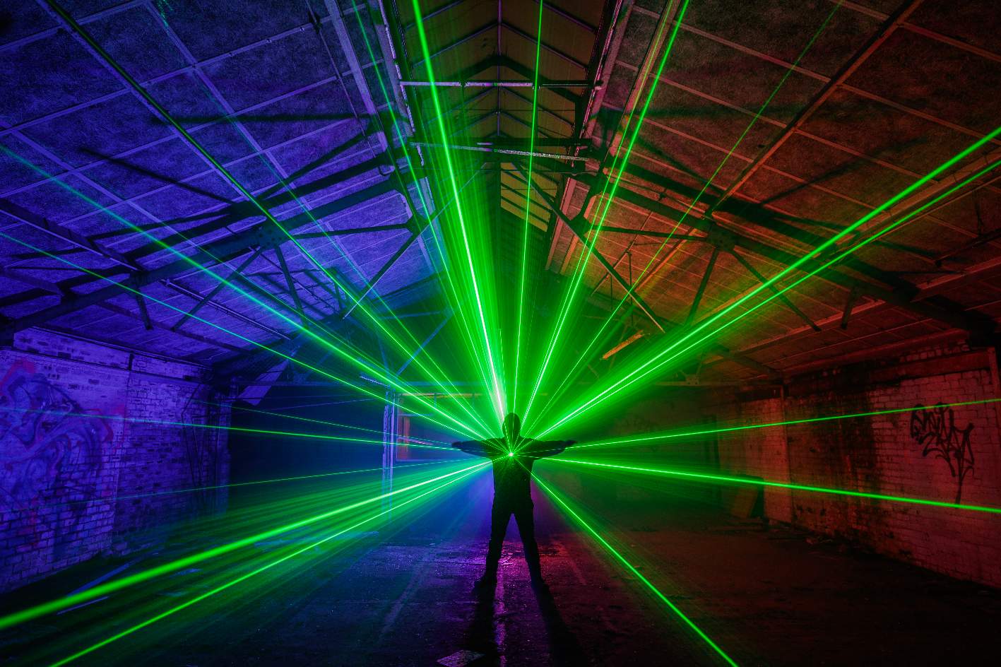 For this shot, we stuck a bit of smoke in the air using a vape and then i got my mate Dave to stand in front of the laser (top tip: check no beams are going to hit the lens before you remove the lens cap unless you like fried sensors). I left the laser exposing whilst I lit up the room from behind him using a multicolor torch.